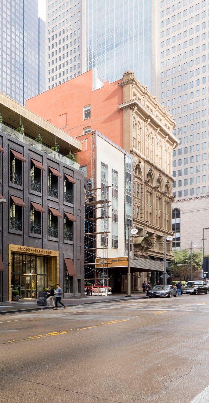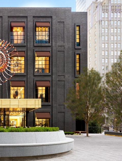 The ground floor houses a cafe and retail area that pedestrians can access, while a valet-only motor court with integrated landscaping, sculptural art, and an ornamental porte cochere provides guests with a covered entry into the building. The second and third floors include additional retail space connected via an ornamental staircase. A bar lounge and a signature restaurant, Mirador, which boasts an outside patio overlooking Dallas’ vibrant Main Street, are on the fourth floor.