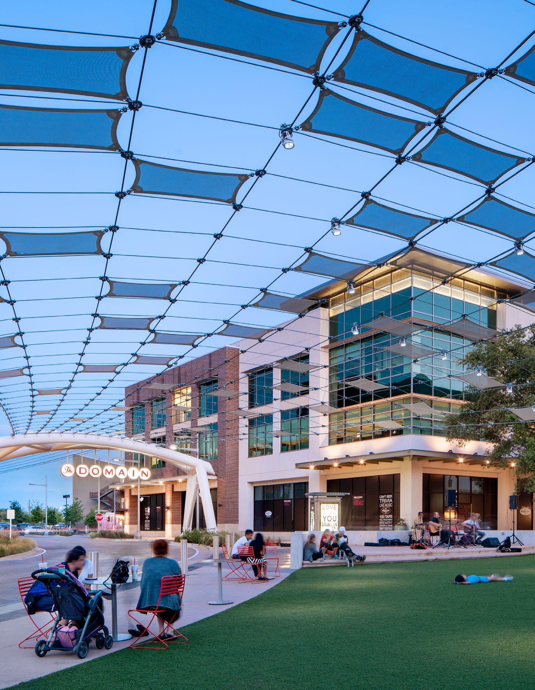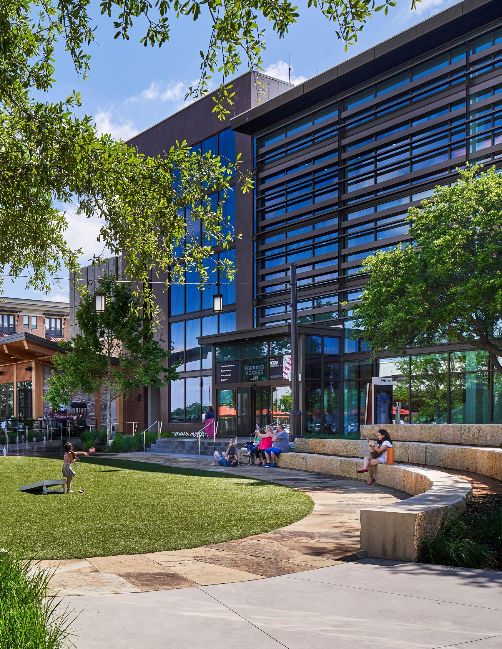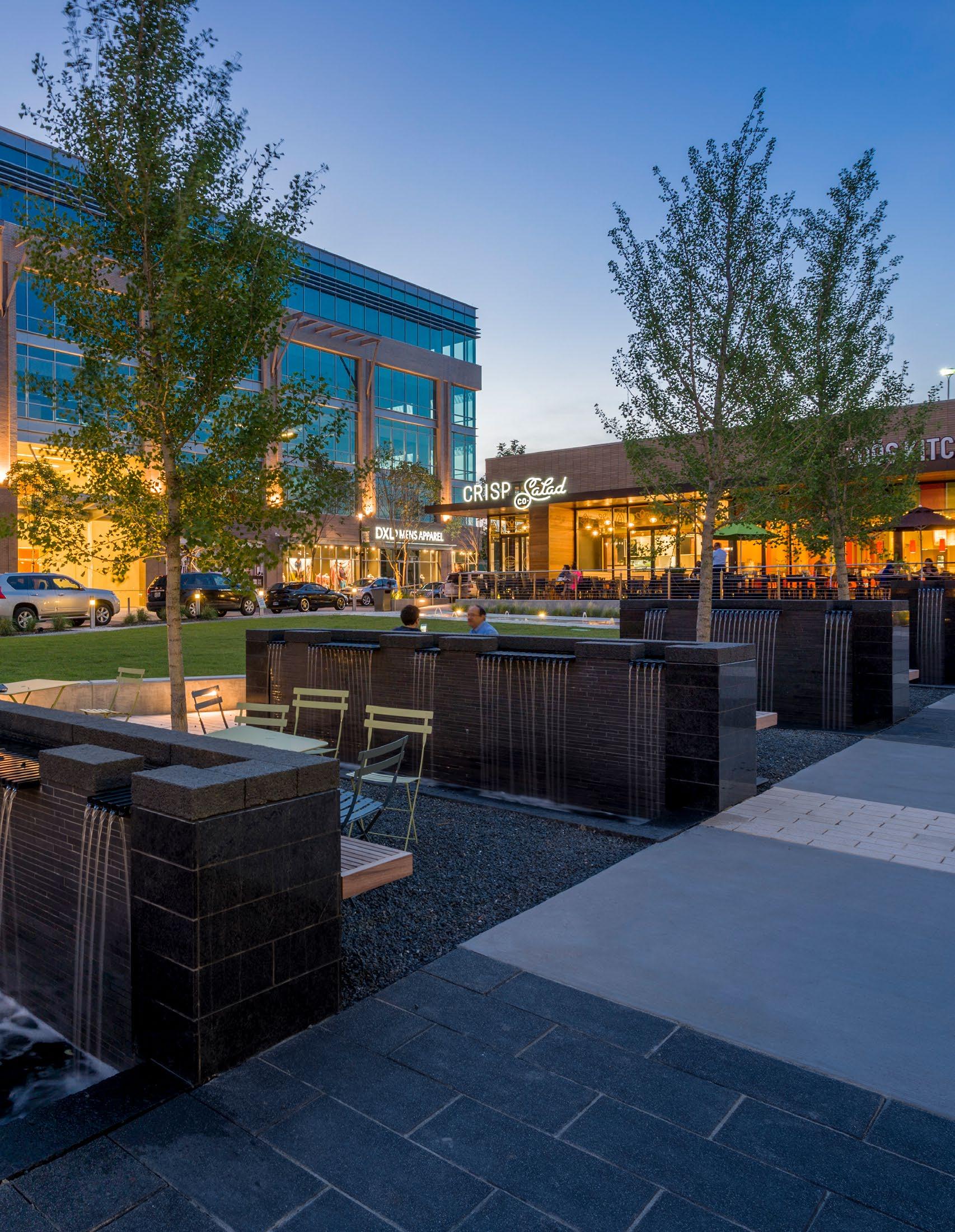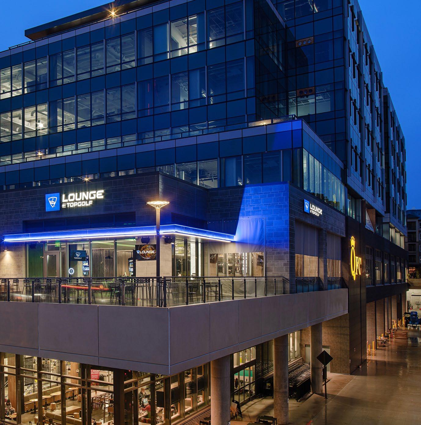40,000 SF Downtown Plaza, food hall, beer garden, 104-ft media wall, sculptures, water features. SITES Silver certification
