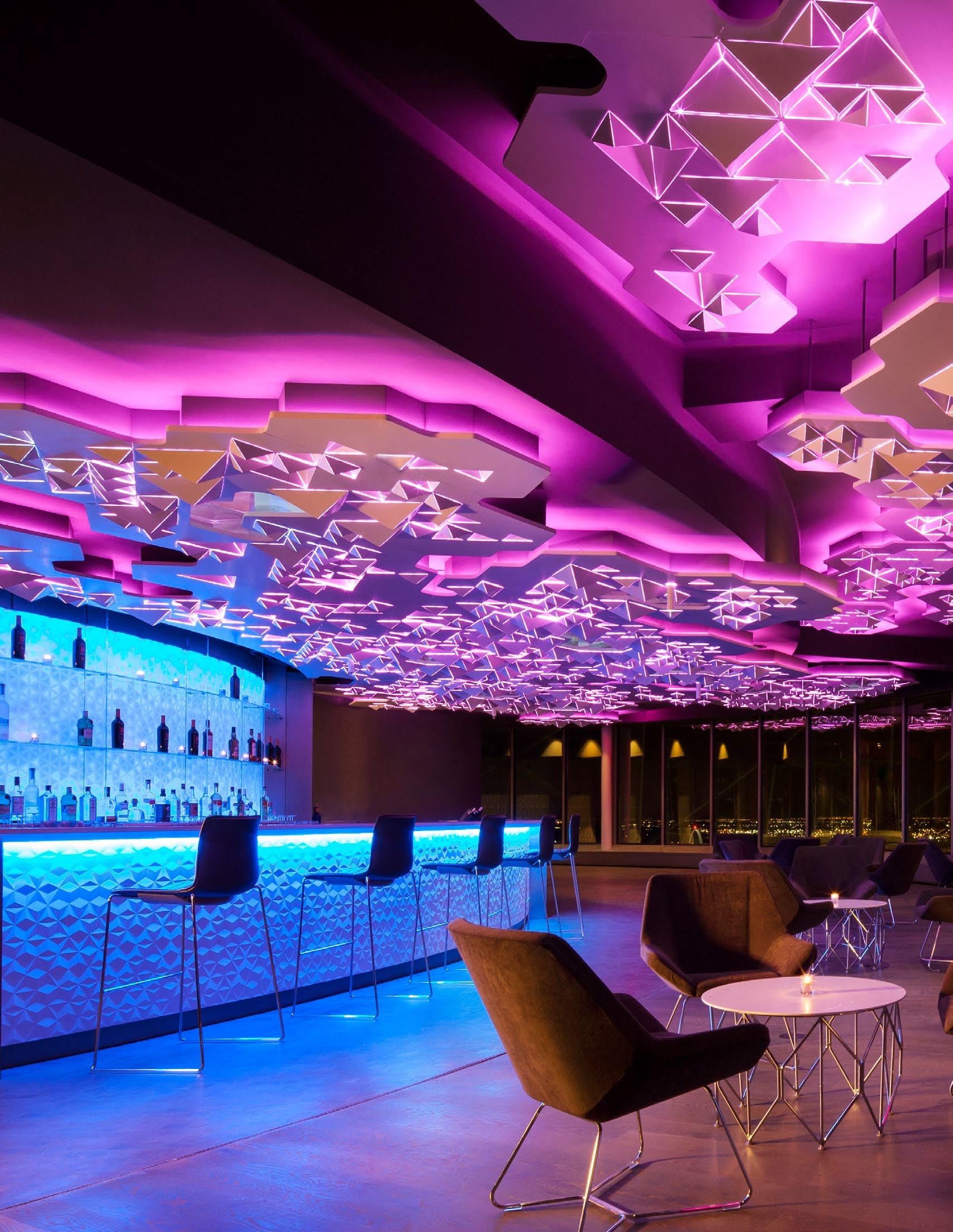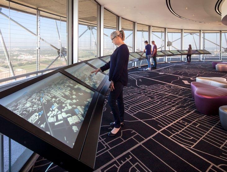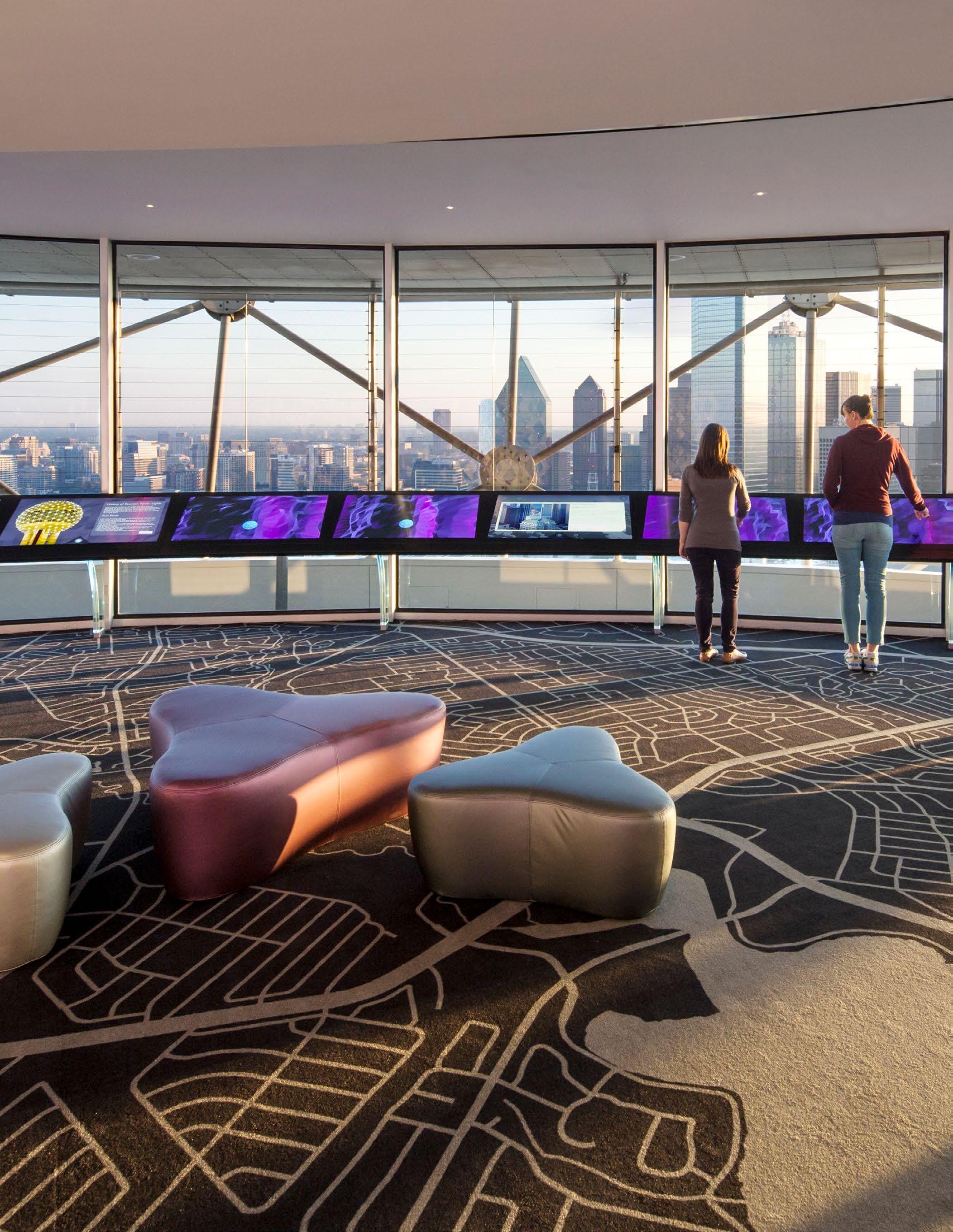 The interior design draws inspiration from the tower’s signature geodesic exterior, incorporating the pattern into walls and ceilings illuminated with dynamic LED lighting. The GeO-Deck features interactive flat-panel touch screens that encircle the space, allowing visitors to engage with the city skyline. Guests can zoom in on specific landmarks using exterior-mounted cameras, enhancing their observation experience.