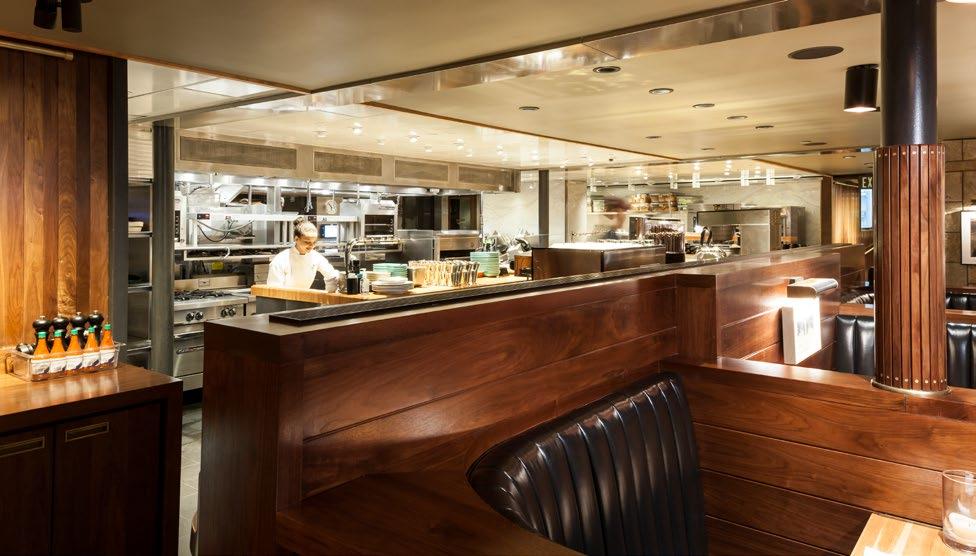 “With intimate booths, exposed wood ceiling beams, and gray-stone walls, Honor Bar’s cabin- chic environs are an intimate den where lunch and cocktails feel special.”