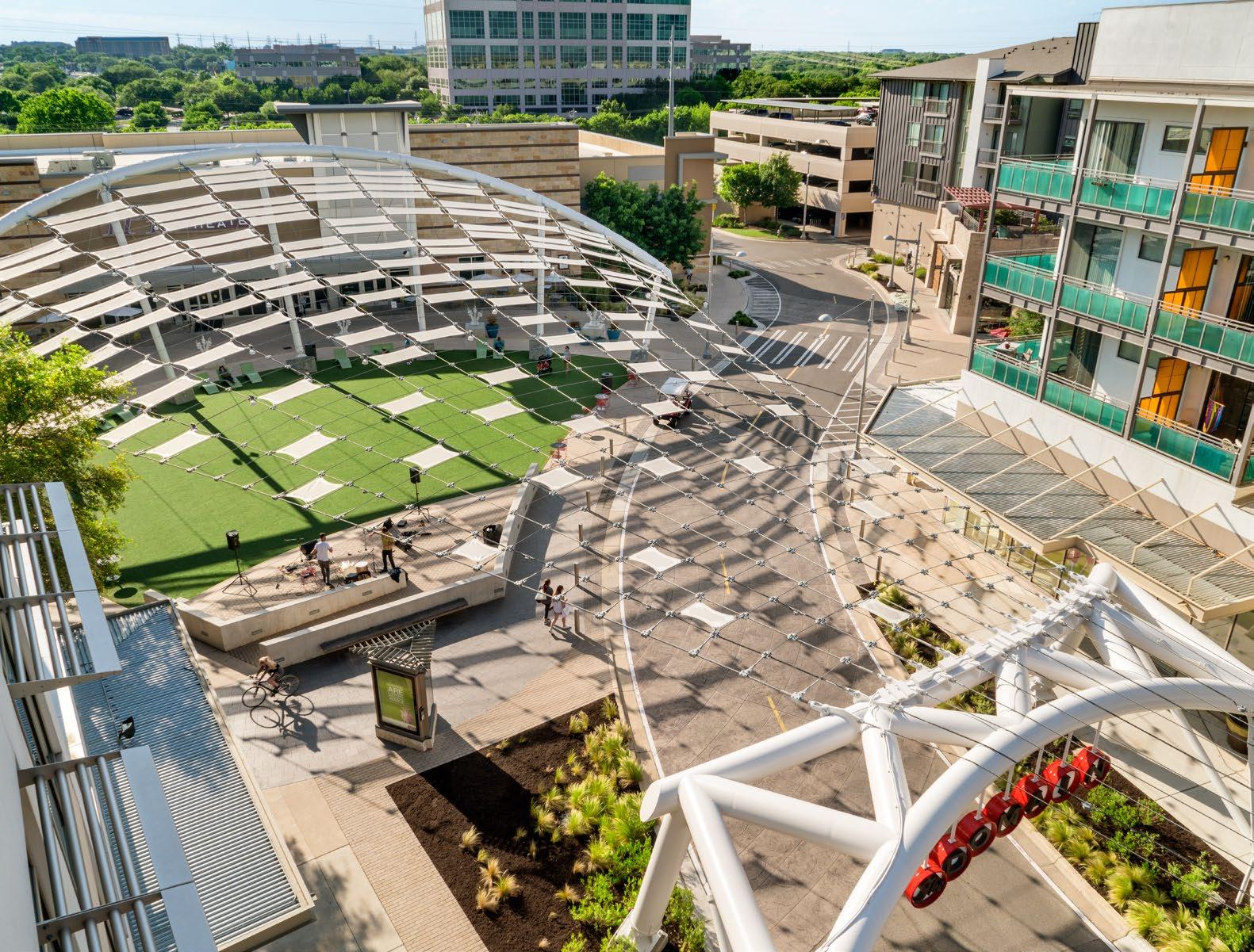 The building façades showcase a variety of materials, including brick, stone, tile, metal panels, and glass curtain walls, creating a visually dynamic environment. The Shops at Clearfork offer a curated mix of luxury and mainstream retail, state-of-the-art entertainment options like a movie theater and venues for bowling and bocce ball, and vibrant dining spaces with al fresco options.