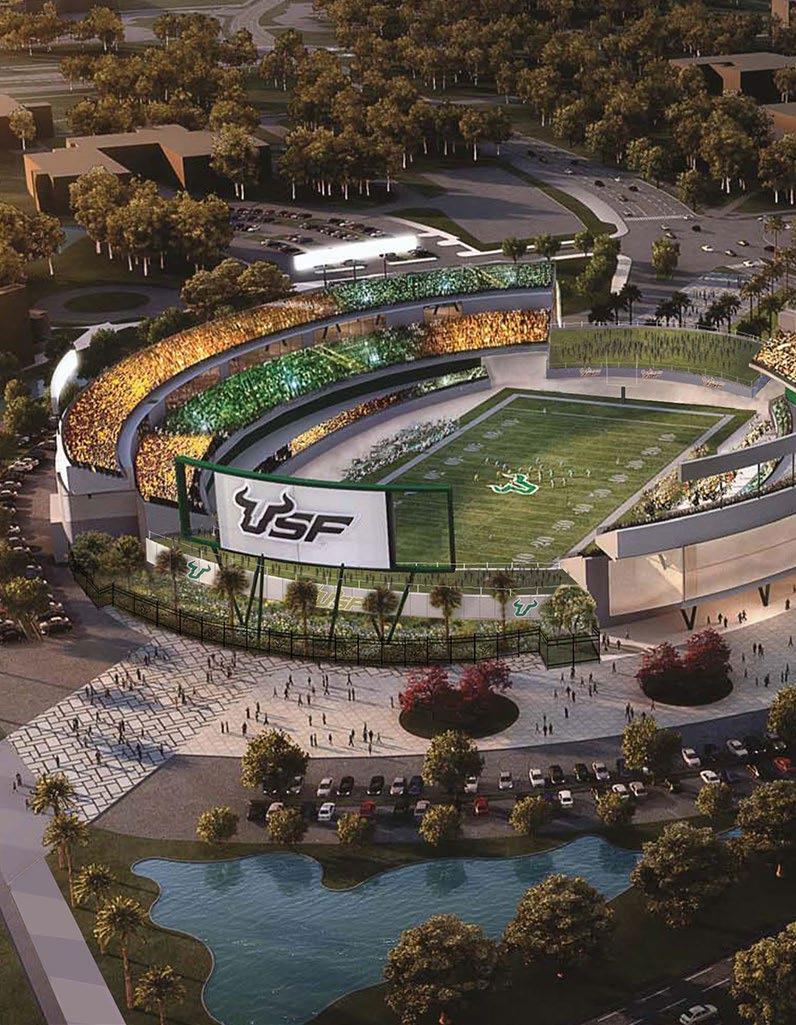 5,517,240 SF, 40,000 (future expansion of +10,000 seats), 20-26 suites and 4-6 Founders Suites, 10,000 gsf of classroom space, space to support the fan experience and promote the USF brand, 13,793 parking spaces, 200 beds + 10,000 sf of conference space, 480 parking spaces