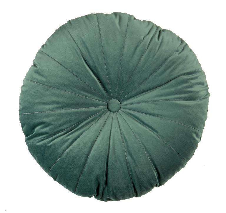 5. Mandarin Grey Green 100% polyester velvet. Tufted button in cushion centre. 40 cm.