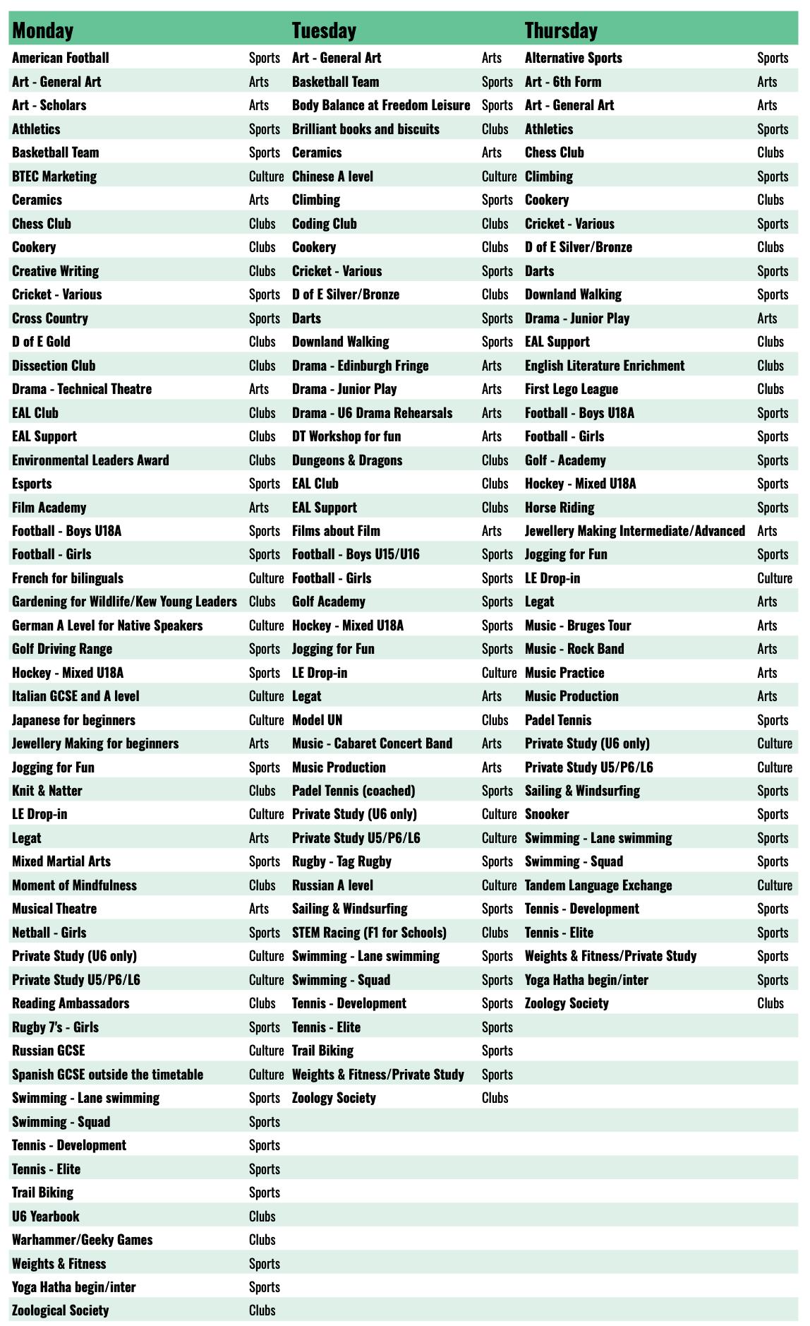 Activities fall under 4 different categories - Sport, Clubs & Societies, Languages & Culture and Creative & Performing Arts. Every pupil of the school needs to sign up for three activities per week - and would recommend a range of activities that include at least one that is a sporting/exercise choice. Some activities are only suitable for certain year groups and you’ll see that these are highlighted in each individual section. Certain activities have an extra cost associated with them, and these will also be highlighted.