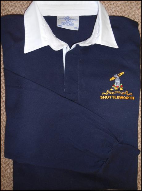 Navy Blue with a white collar and the Shuttleworth crest.