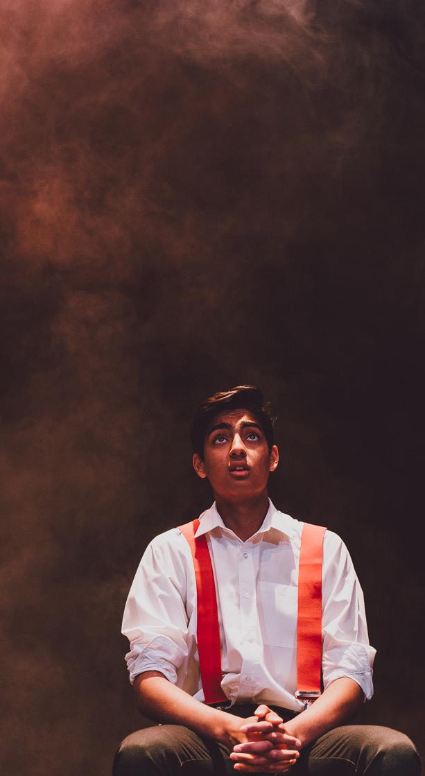 The stage is pitch black and then a spot light slowly brightens to reveal a boy sitting on a chair, clearly in a world of his own with a dull/empty look on his face tapping his foot on the floor. The boy slowly begins to speak as he awakens from his own reality.