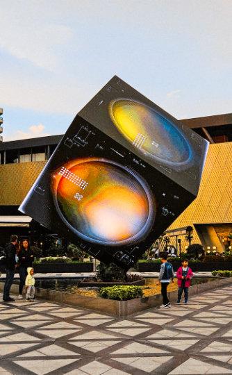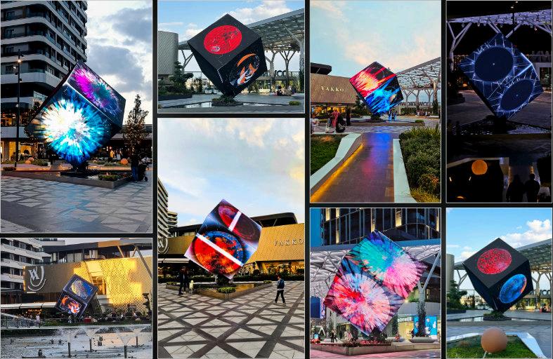 This work of art shows that water is the source of life, the triangle is an elemental form and the cube symbolizes universal order. These layers of elements came together to create this exhibition.