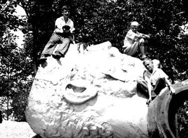 Two boys gaze up at Vulcan’s spear. In this image, the spearhead has not yet been replaced by a neon torch, which was added in 1946 as an illuminated beacon constructed over the spearhead in the Vulcan statue’s right hand. The torch operated until 1999, when it was removed from the statue, but restored and installed inside the park’s Visitors Center as an interactive exhibit helping tell the story of Vulcan’s long career. Visitors can press a button to illuminate the torch with green neon.