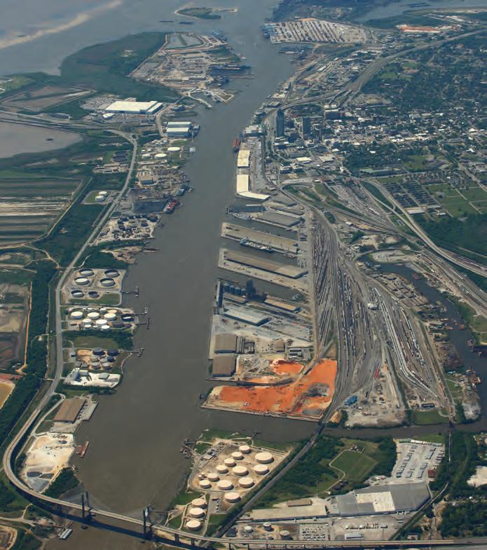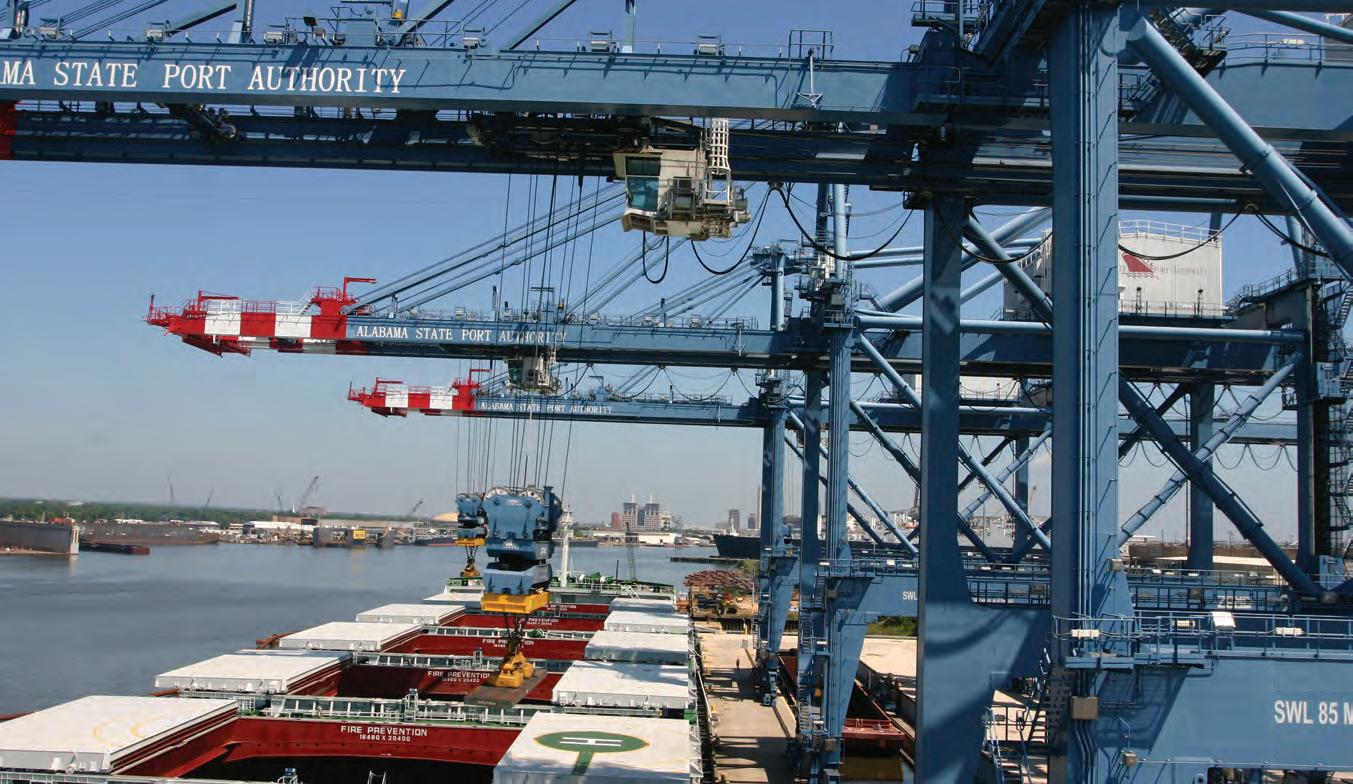 Topleftandright: Alabama’s only seaport and its role in global trade can be traced back to the early explorers who sought the region’s natural resources for the crowns of Europe. In 1922, the Alabama state legislature authorized the construction of the Alabama state docks on 500 acres north of Mobile’s waterfront. The docks were opened officially in 28 and served to increase the region’s commercial shipping capacity.