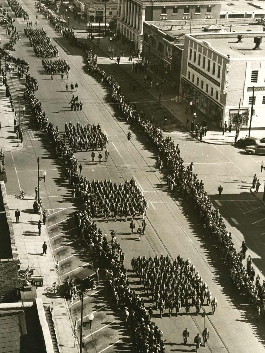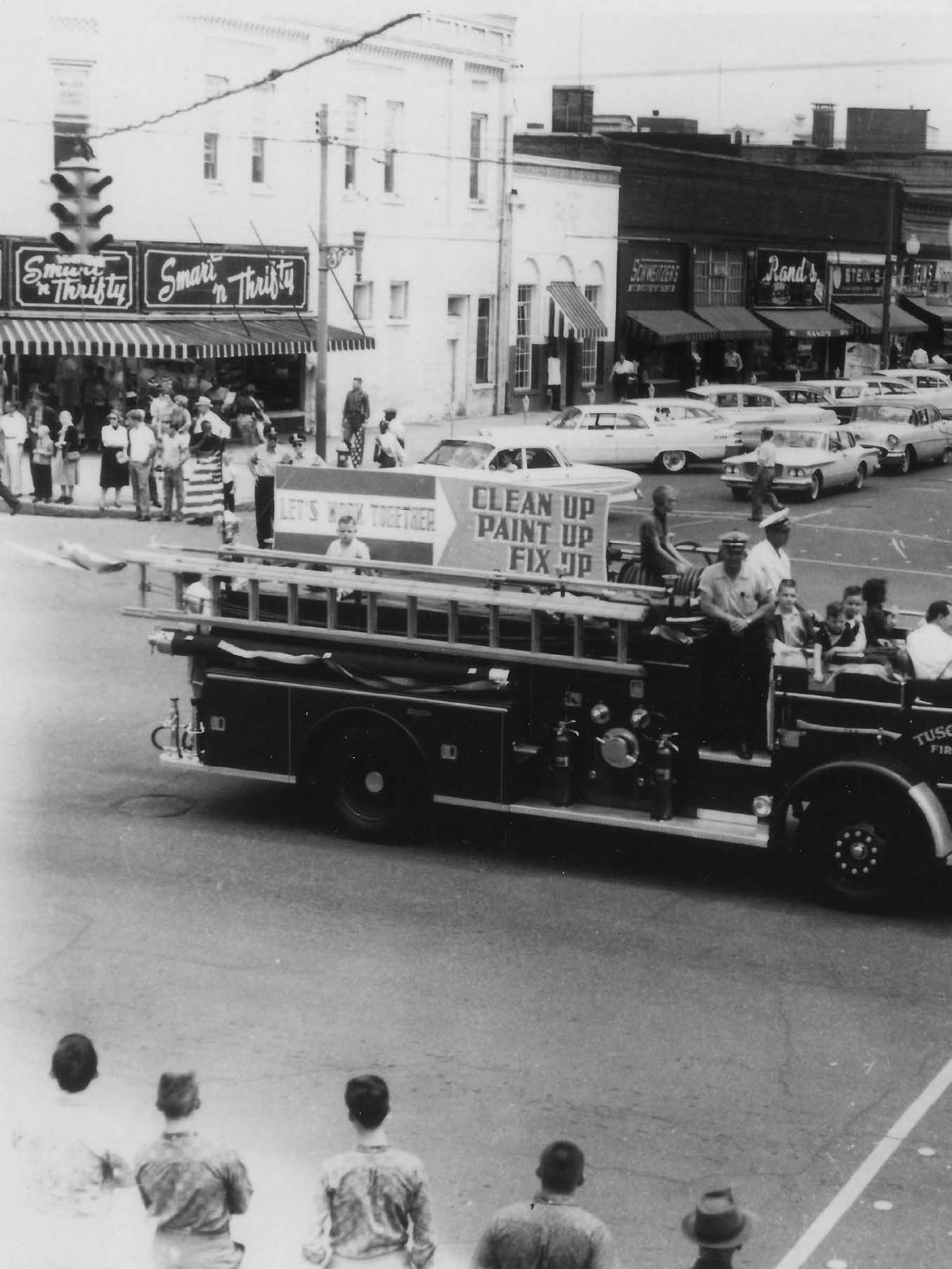 Firemen and children alike rode the shiny, flag-carrying truck in this downtown parade in the nineteen fifties, urging a brighter, cleaner community. The cars of other participants stretched behind them. Photo courtesy of Tuscaloosa Fire and Rescue Service.