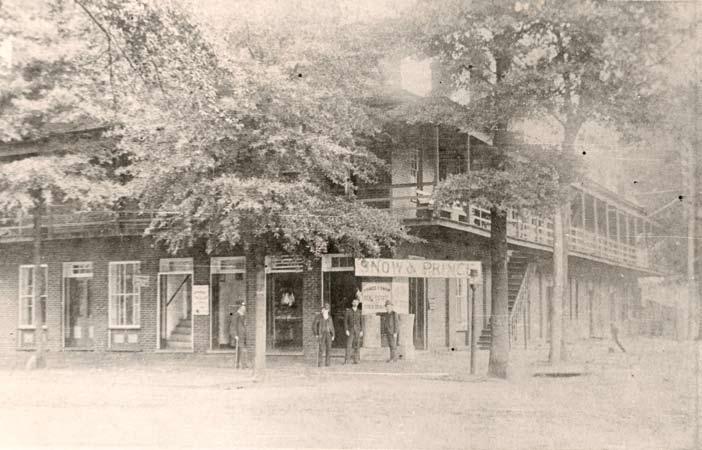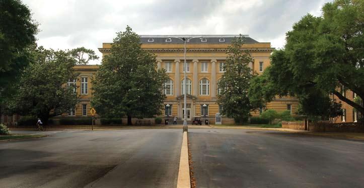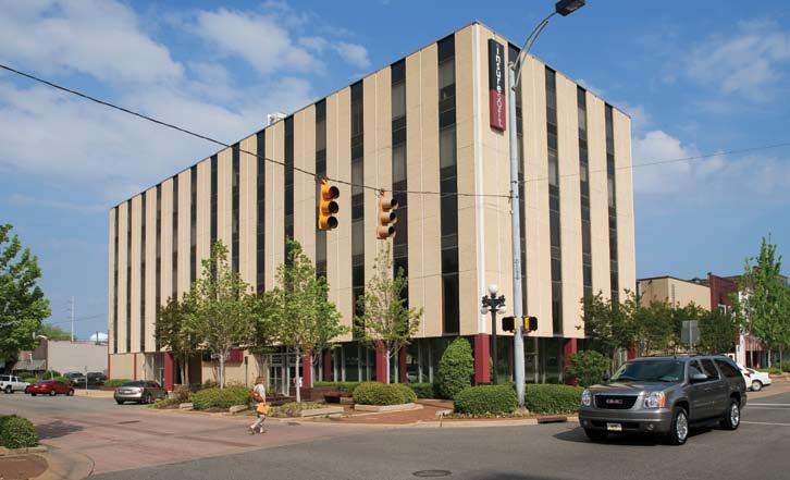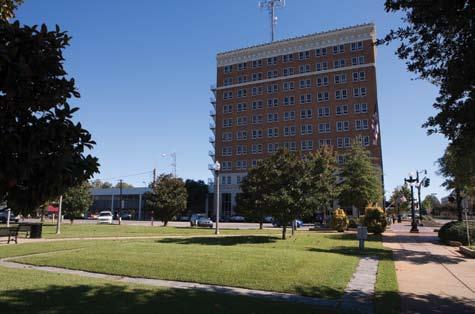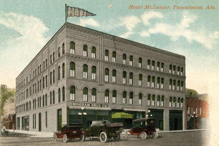 If the reader looks at the McLester Hotel on page 20, in its earliest days, and then on this page, it is easy to see common elements that remained through the years. In the image behind the monument, the hotel’s side bay windows are still in place. The hotel later acquired the building to the right of it and incorporated its more uniform, squared appearance which can be clearly seen in the more modern photo below. For a bird’s eye view of how these buildings were all joined together please see the aerial photo on page 10. Photo courtesy of W. S. Hoole Special Collections Library, U.A.