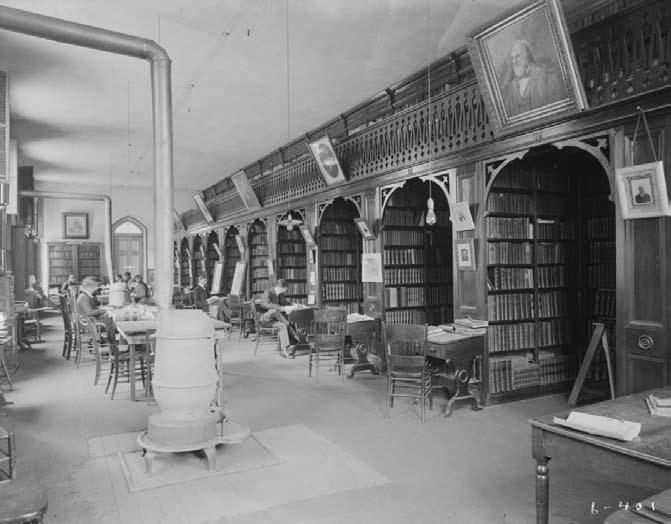 The University Library ca. 1880 was located on the first floor of Clark Hall. Today, Clark Hall is a symbol of awesome design and materials, embodying terra cotta tiles, stained glass windows, turrets, and pinnacles popular in the Victorian style of the 1880s. Originally, its first floor housed the university library, reading rooms, and a chapel, while the second and third floors contained a large public hall with a balcony. Photo courtesy W.S. Hoole Special Collections Library, U.A.