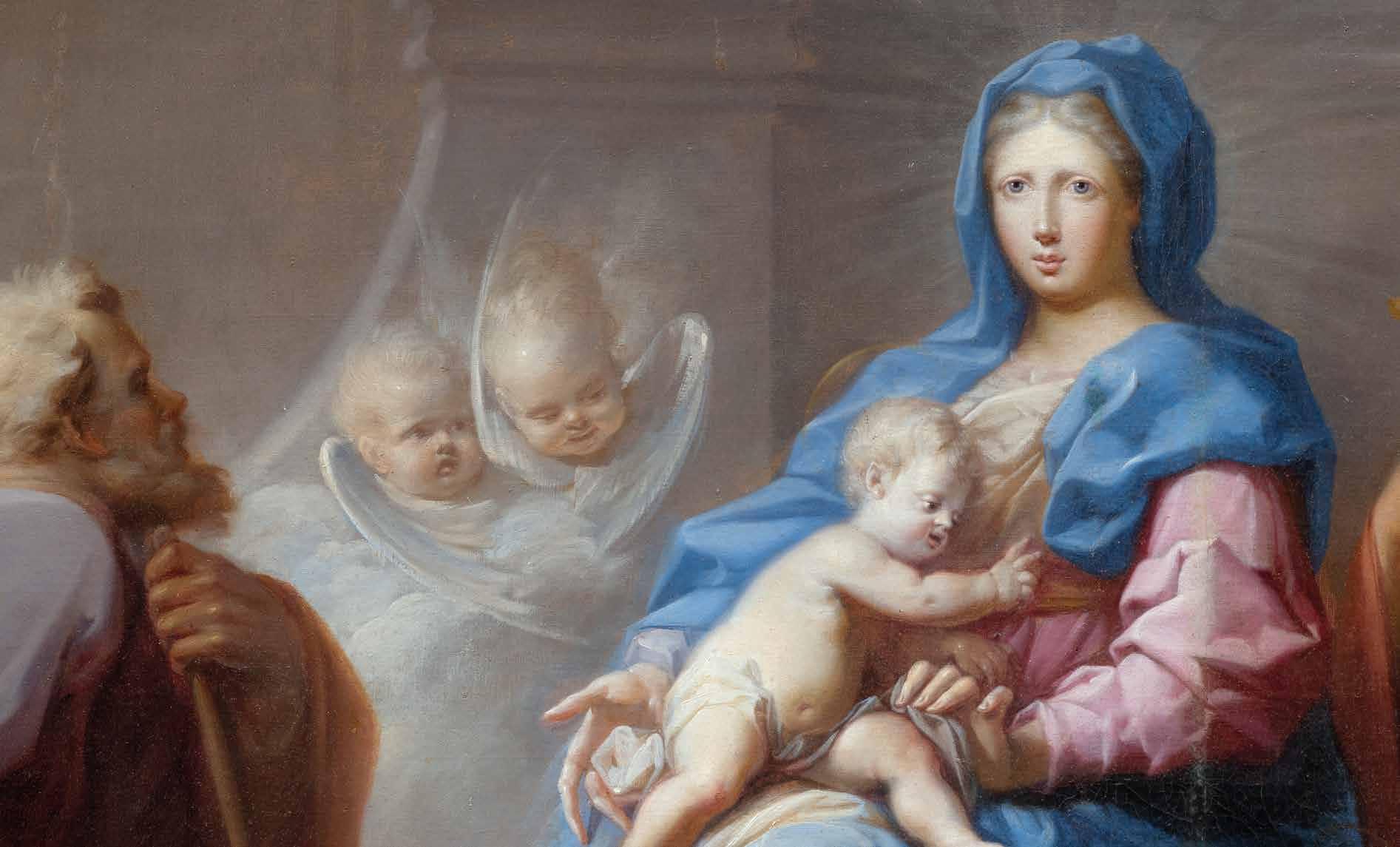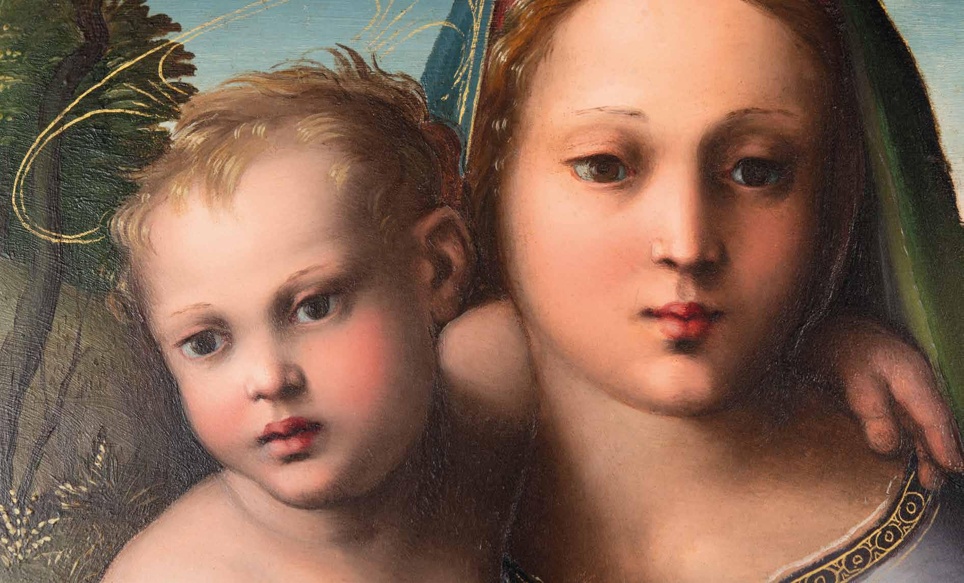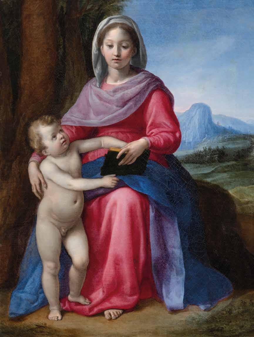 A very important piece of the puzzle in reconstructing Francesco Conti’s early career, the central part of this horizonal altarpiece depicting the families of Christ and the Baptist has ties to a known work by the Florentine painter, the Madonna with Child (oil on canvas, 145 x 116 cm - 57 x 45,6 in) owned by Intesa Sanpaolo Bank. In a recent study a relationship to and analogies with works by Andrea del Sarto had been observed. Conti’s profound meditation on Andrea’s renowned works, venerated in Florence by generations of artists down to the 19th century, is all the more evident in the painting presented here, which can be considered an authentic homage to the painter “without flaws”. In particular, in this rediscovered composition by the 18th century artist, the allusion to Andrea’s Madonna of the Harpies, now at the Gallerie degli Uffizi, is clear not only in the arrangement and in the facial features of Mary and the Child, as in the Intesa Sanpaolo Bank Madonna with Child, but also in the Virgin’s position in a niche, similarly framed by slightly projecting