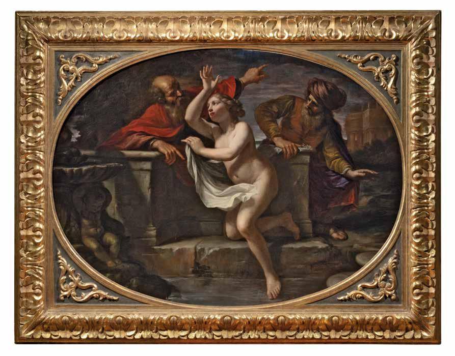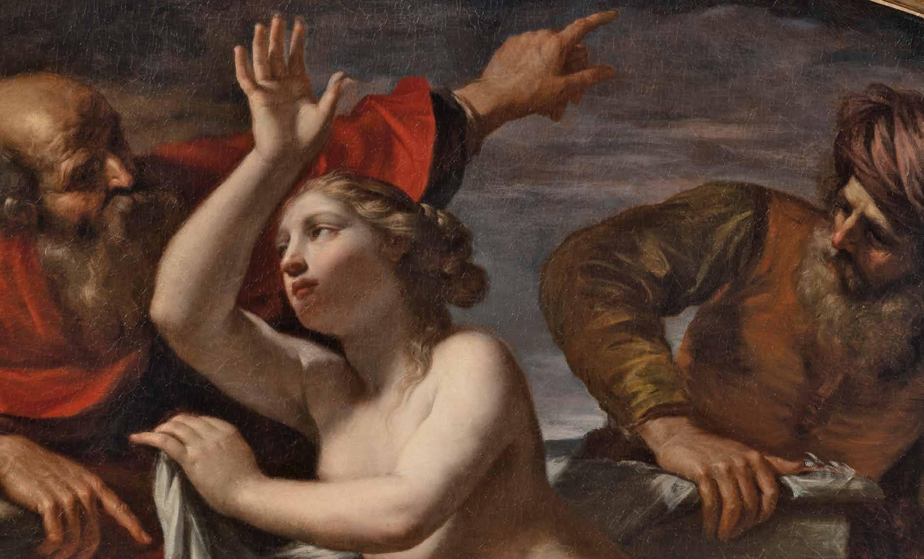 and poses, lending solidity to the characters’ desires and fears. The subject certainly calls for such a rendering of the gestures, colors and lighting: the Biblical episode from the Book of Daniel tells the story of a very beautiful and pious woman, Susanna, who is spied upon while bathing by two old men in her husband’s house. These two men, judges in the Hebrew community, try to bribe the young lady, threatening to tell her husband that she is unfaithful - which they know to be a lie - unless she gives herself to them. The young woman’s refusal leads them to bring her to trial. Only Daniel’s intervention saves the young lady from the sentence of stoning. This painting of Susanna and the Elders by Cesare Gennari can be considered a masterpiece of the 1670s, an homage to Guercino and other painters emerging during those years, such as the aforementioned Pasinelli. In terms of some stylistic details, Cesare Gennari seems to anticipate the great Ubaldo Gandolfi.