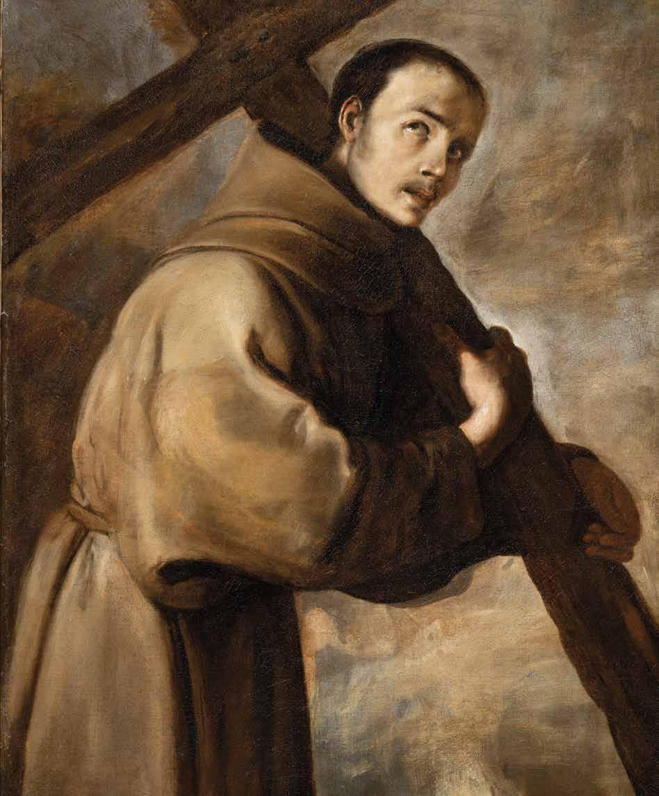 Like a wanderer lost in thought, the Franciscan friar walks slowly beneath the weight of the burden he has chosen to carry: a very simple cross, its two axes nailed together, the quintessential symbol of Christianity, of redemption, of Christ’s love for humanity. The Saint is acknowledged to be one of the most important saints venerated in Spain and throughout the Americas: St Didacus - in Spanish, Diego - of Alcalà, who lived in Spain in the first half of the 15th century (and for whom the city of San Diego, California is named). The blue-grey sky, which recalls the sort of marbleized paper used for valuable tomes, makes the depiction timeless. There is no background or differentiating light, no landscape, no detailed description of place: time has stopped in this hushed canvas, offering us time to reflect, to imagine God’s love, as well as that friar’s love of God, a binomial that exemplifies Christian faith. This powerful representation, consummately characterized by the beam of light emanating from the upper left of the painting, by the brushstrokes - dense in the light areas and more liquid and rapid in the half-tones and dark areas -, and by the anti-academic rendering of reality in the young friar’s slightly cross-eyed look, guide the work’s attribution to the Spanish area, and specifically to just after the middle of the 17th century. One of the most important Spanish painters of that epoch, and in general, was Bartolomè Murillo (1618 Sevilla - Cadiz 1682) who can be considered a full-fledged Baroque painter. Although his early style was Caravaggesque