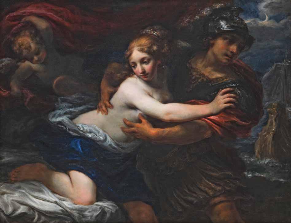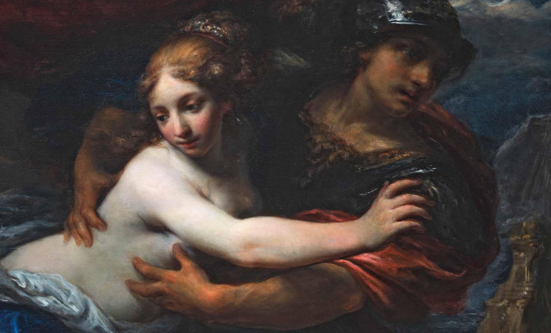 a night of love and the abduction at the same time. The style and the features of the composition are unequivocally typical of the Florentine painter, who apprenticed first with his father Giacinto and later with one of the most important Tuscan painters at the time, Simone Pignoni. It was common practice for young painters to travel and sojourn in other cities, and among Francesco Botti’s travels, Venice must have influenced him enough that he sought to imitate the characteristics of a few painters like Sebastiano Mazzoni and Antonio Carneo, creators of atmospheric scenes bathed in or dusky twilight or moonlight. Our painting can be placed in the early part of the painter’s prime, and must be considered one of the greatest achievements in his oeuvre, and of non-religious Florentine painting of the second half of the 17th century. The figure of the woman can be compared with the Sophonisba in the Museo Civico di Montepulciano and the Veronica in the Royal Windsor Collection. The figure of Paris can be juxtaposed with one in a painting depicting Venus and Mars which belong to the Florentine galleries but is on loan to Palazzo di Montecitorio in Rome.
