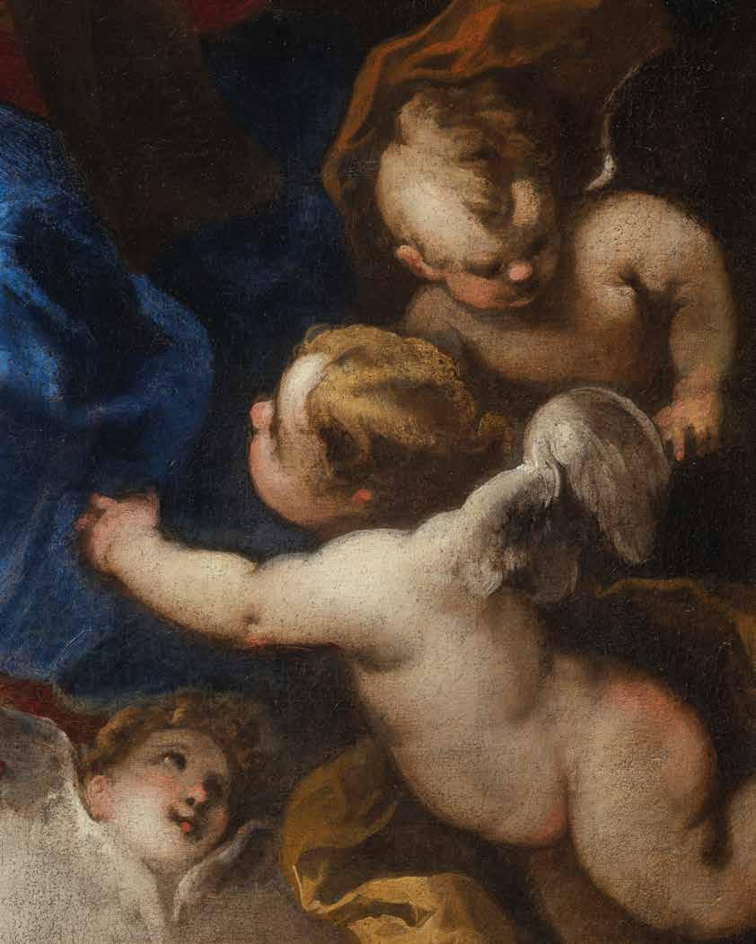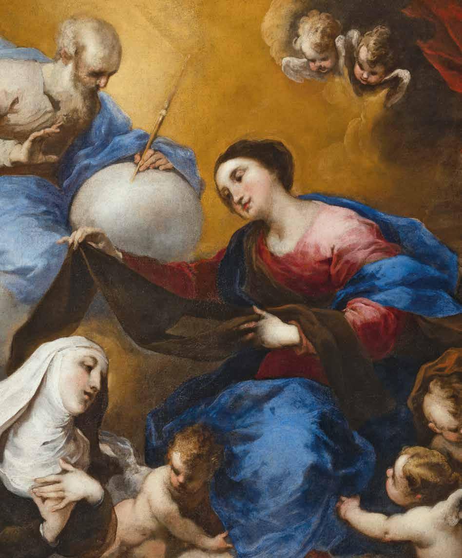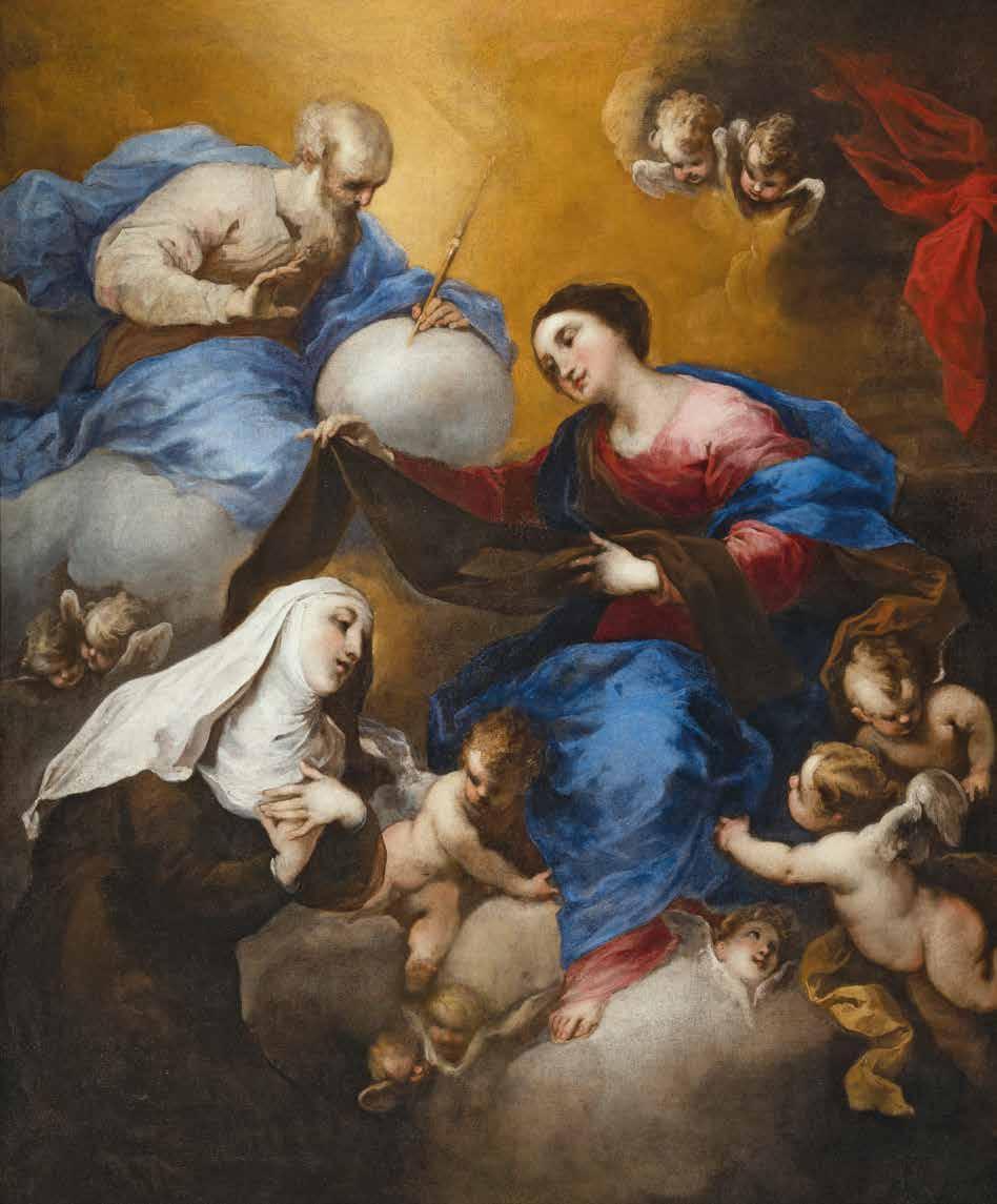 This exquisite canvas with its extraordinarily sumptuous blues and reds was first presented by Giuliana Biavati in 1962, when it was in the collection of the Genoese ship owner Angelo Costa. The painting is considered fundamental to understanding Valerio Castello’s inventive transition to an early Baroque style, and consequently his great influence in guiding Ligurian painting in Liguria towards modernity. The canvas depicting The Virgin, God the Father and a Carmelite saint is the size of paintings typically meant for a private chapel in a noble palace. The Carmelite order had a significant presence in Genoa, thanks to Nicolò Doria (1539-1594) who founded the
