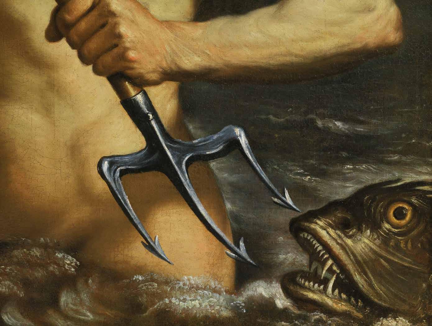 The strong chiaroscuro, which almost seems to suggeest a flash of light emanating from a time and place outside the scene, underscores the work’s sculptural power: the three-quarter-view bust of the god and the impetuous gesture with which he brandishes his trident catapult him beyond the twodimensional surface of the painting, making him a concrete presence in the viewer’s space. The bit of shadow on his left shoulder, the gradual slide of light over the chest, and the well-defined anatomy with chiaroscuro contrasts all exemplify the painting prowess of the Bolognese master, one of the most representative of the Italian 17th century, the painter who perhaps more than any other was able to realistically render flesh and the pulsing blood beneath it.