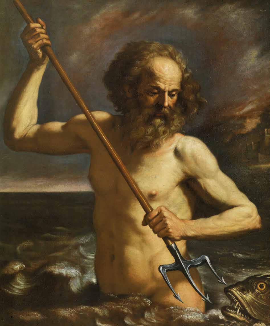 The canvas reflects Guercino’s style at the beginning of his mature phase: the sea god rises majestically from the water fiercely brandishing his trident; the sea in the foreground is foamy, but becomes calm in the background, blending with the whitemisted sky on the horizon. The god’s head is markedly Guercinesque, recalling the series of bearded apostles from the 1630s, or one of