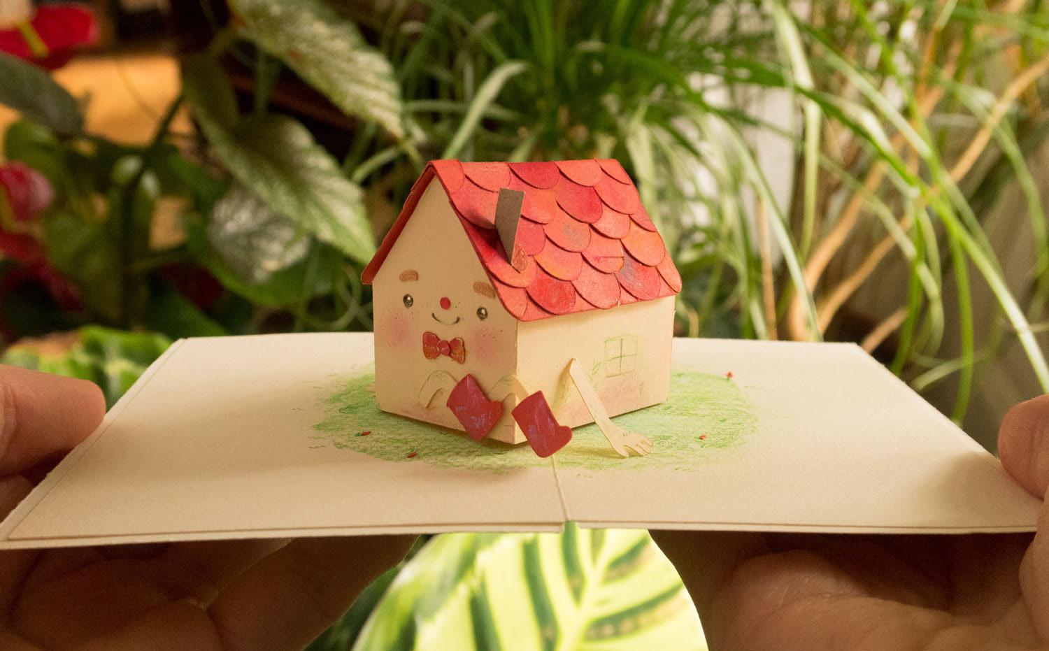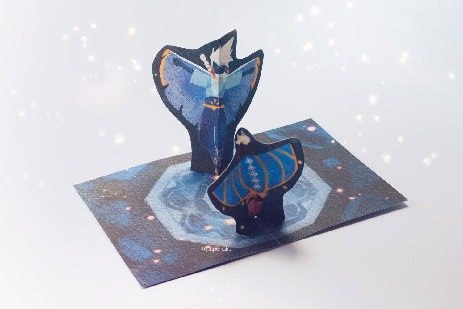 Tarjetas emergentes hechas a mano revelan a dos niños Sky a punto de abrazarse en diferentes áreas del reino.