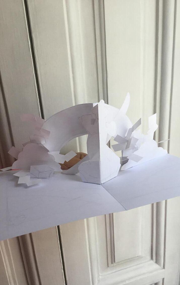 Pues mi proceso de convertir ilustraciones a tridimensional es un proceso muy chapucero pero creo que tambien es lo bonito de trabajar con pop-up, que por mucho que quieras hacerlo calculado y bonito Hay un montón de factores que que juegan a tu favor y en tu contra a la hora de crearlos, así que por muchas veces que yo me crea un diseñadora pop-up que lo ha hecho perfecto en illustrator, hasta que no lo imprimo, doblo y lo pego, no veo todos los fallos que no había calculado. Así que es un proceso chapucero y divertido a la vez.