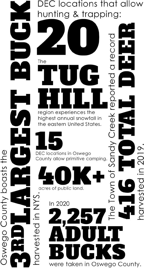 DISCLAIMER: This guide was developed as a marketing tool and is meant to provide an overview of the fishing and hunting opportunities in Oswego County, New York. Oswego County Tourism does not specifically endorse any fishing guide, charter, outfitter, advertiser, or location. Nor does Oswego County Tourism accept any liability for trips to the area based on the contents of this guide. Additionally, users should always refer to the NYS DEC for any specific questions regarding hunting or fishing regulations.