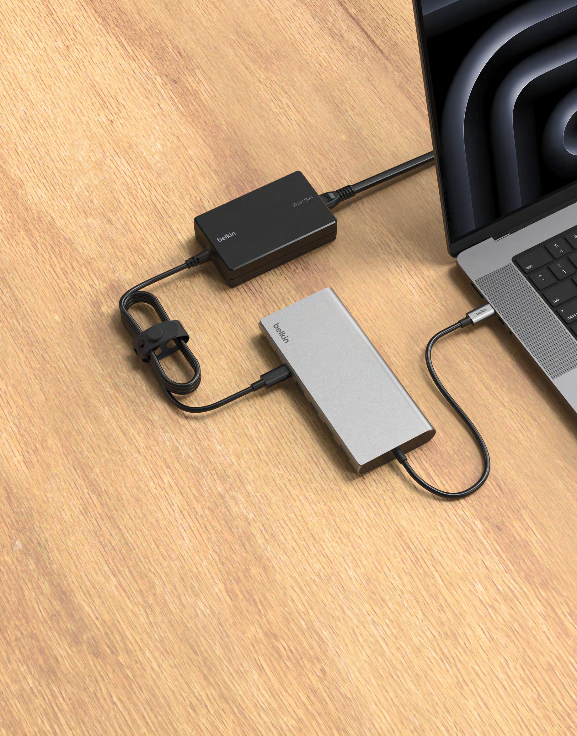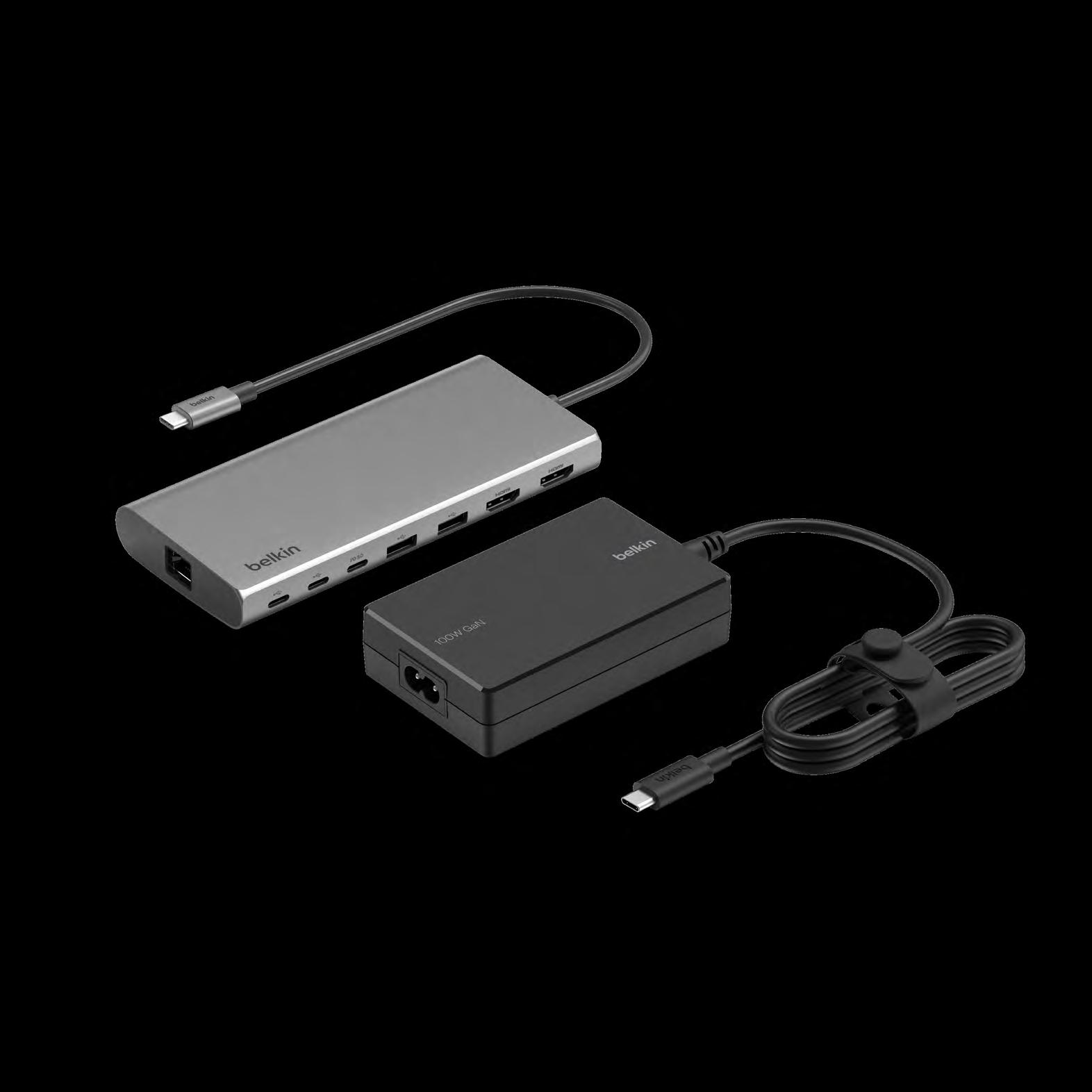Our USB-C Core GaN Power Adapter 100W pairs with the Universal USB-C 8-in-1 Dual Display Core Hub to add a power supply. The adapter charges host devices like laptops and tablets while the hub features a fast, reliable gigabit Ethernet connection. The new 8-in-1 hub adds peripherals and productivity to your workstation and allows users to connect to dual displays
