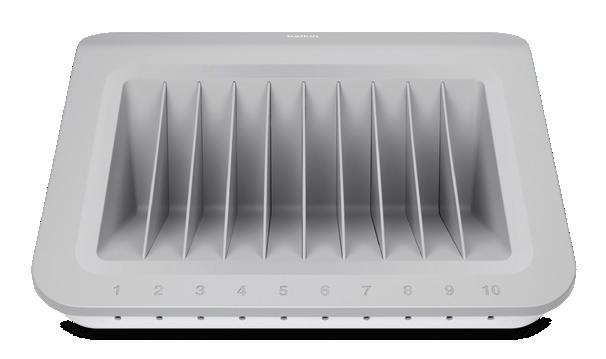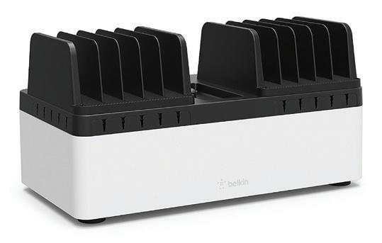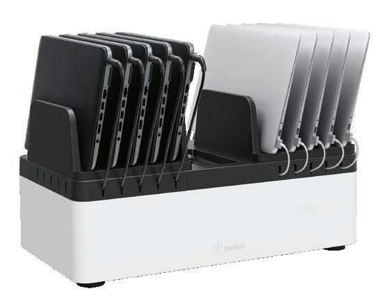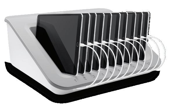 • Wide-angle slots fit most tablets and cases and store/charge up to 10 devices at once.