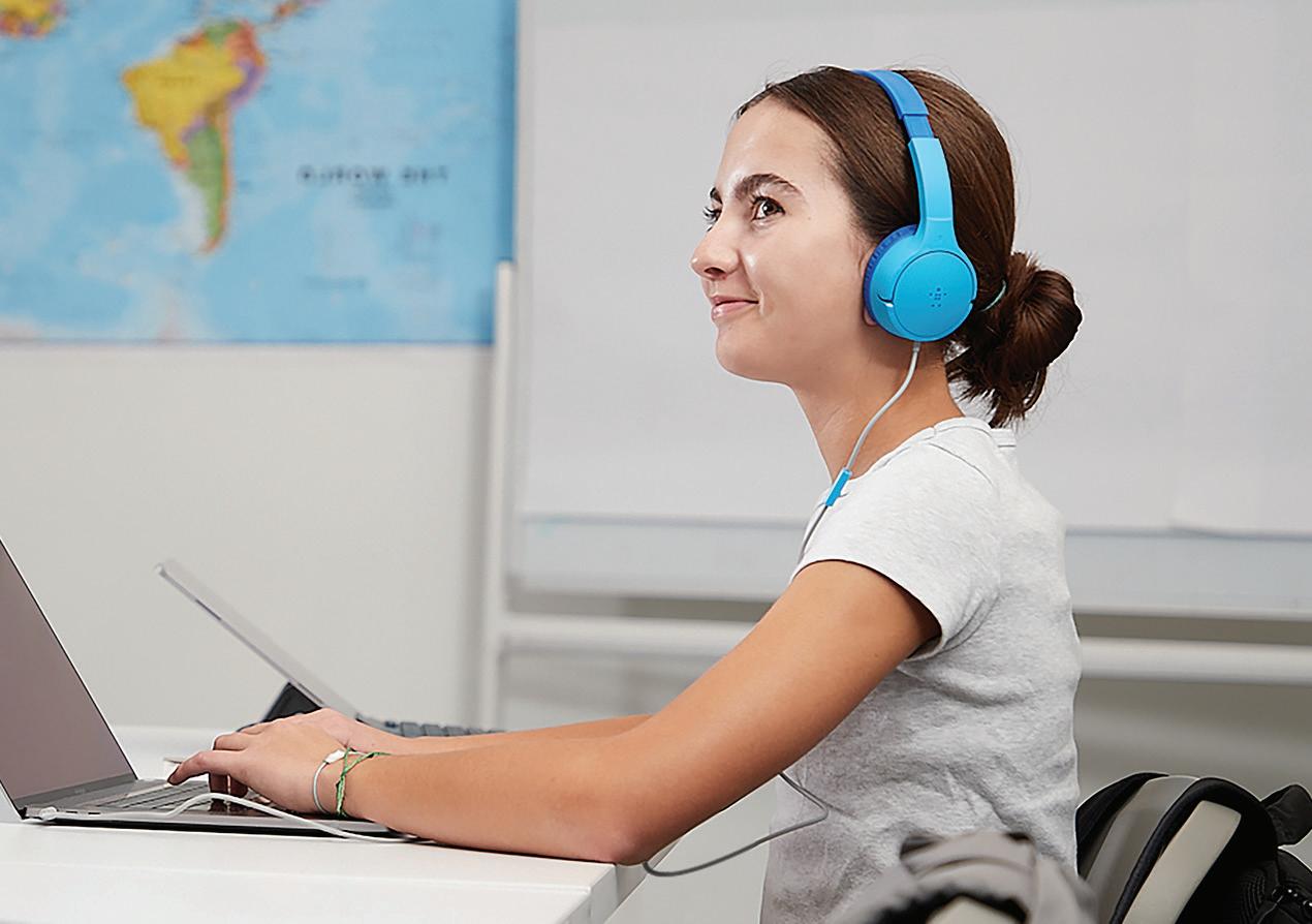 Belkin audio solutions for kids are designed with young learners in mind. Our headphones come with SafeSound volume limiters to protect hearing, spill-resistant materials for those 'oops' moments, and a kid-sized fit for ultimate comfort. With easy-touse controls and simple connections in both wired and wireless options, these are a must-have for any learning environment.