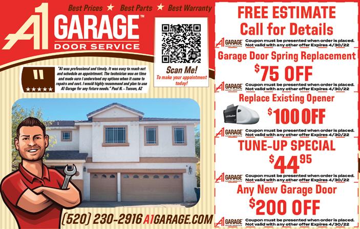October 2022 | WelcomeHomeAZ.net 13 OUR PRICES WILL NOT BE BEAT! ROC #319940 Call for FREE Estimates 520-201-1886 IRONDOORSARIZONA.COM Visit Our New Tucson Showroom 6741 N Thornydale Rd #131 Tucson, AZ 85741 Manufacturing Installation Largest Iron Door Showroom in Arizona Over 400 Doors in Stock! Before After