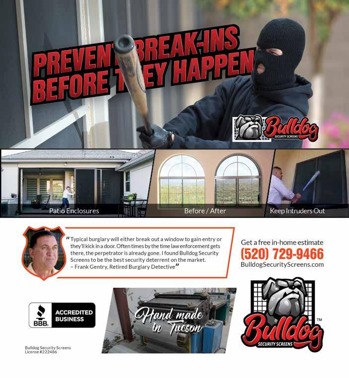 18 WelcomeHomeAZ.net | October 2022 Tucson’s #1 Concrete Coating Specialists We Make Your Garage, Patio, and Concrete Floors Look AMAZING! AZ ROC #310242 Licensed, Bonded & Insured Residential & Commercial FormulaConcreteCoating.com /formulaconcretecoating $100 OFF 350 sq. ft. or more With this ad. Not valid with any other offer. Expires 11/15/22. Your Money Does More When You Buy Local! 520-475-3344 1 Day Installation FREE ESTIMATES! 520-314-4522 SSPCArizona.com ROC#CR6-316530 DON’T LET THIS HAPPEN TO YOU! Custom Fit to Your Pool and Water Features! RESIDENTIAL & COMMERCIAL $225 OFF Must mention ad. Not valid with other offers. Expires 11/15/22. ONE POOL COVER... FIVE GREAT BENEFITS! Keep Your Pool Clean, Warm, Low Maintenance and Most of All: SAFE!