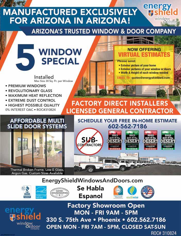 68 WelcomeHomeAZ.net | February 2023 PRESORTED STANDARD US POSTAGE PAID DENVER, CO PERMIT NO. 5377 Sam@welcomehomeaz.net 480-570-2539 *Offer valid for 3000 AMI Series windows only. Offer expires 03/31/2023. White frame only. Single-slider only. Each window may be up to 6' X 6' in size. Retrofit installation only. Some additional fees may apply. Not valid with other offers or prior purchases. **Window World received the highest score in the retailer segment of the J.D. Power 2022 U.S. Windows and Patio Doors Satisfaction Study of customers’ satisfaction with windows and patio doors. Visit jdpower.com/awards for more details. This Window World® franchise is independently owned and operated by (DBA) Window World of Phoenix under license from Window World, Inc. ROC # 224119 Nearly half of our customers come directly from Here’s why: ✓ LIFETIME WARRANTY on Product, Labor, & Glass Breakage ✓ SLIM FRAME WINDOWS offer up to 40% more glass ✓ RATED HIGHEST at keeping out the heat & UV rays ✓ NO STUCCO Damage or Painting ✓ NO PRESSURE, No Gimmicks, No Hassles of every style! Ask about Privacy Glass! Exceptional Quality Made in USA H I G H E S T I N C U S T OM E R S ATI S FACTIO N among Window and Patio Door Retailers ** #1 PRICE #1 ORDERING AND DELIVERY #1 SALES STAFF AND SERVICE Schedule TODAY! (602) 691-6443 WindowWorldPhoenix.com 2530 W . Holly St. Phoenix, AZ 85009
