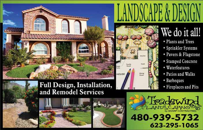February 2023 | WelcomeHomeAZ.net 29 ROC #323848 LICENSED, BONDED & INSURED PAVERS, TRAVERTINE, ARTIFICIAL GRASS, FIRE-PITS, LIGHTING, BBQS, IRRIGATION, PLANTERS, SEATING AREAS, MUCH MORE! 480-316-5941 FREE DESIGN CONSULTATION Call for details. DREAM • BUILD • CREATE ENVY