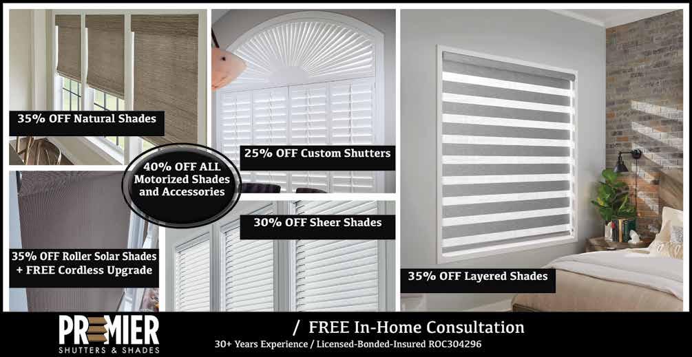 64 WelcomeHomeAZ.net | February 2023 Patio Screens Interior Shades Window Solar Shades Roman SHADE SALE! The Valley’s Leading Shade Specialists 602-956-1642 Call for a FREE in-home estimate! libertyawningsandshades.com