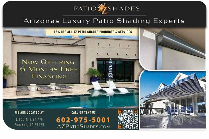 34 WelcomeHomeAZ.net | February 2023 Family Owned & Operated Custom made wrought iron furniture Hundreds of fabrics to choose from Your choice of powder coated finish We refurbish furniture Furniture sets in-stock and available today! Made Right Here in the East Valley! 5307 S Power Rd • Mesa, AZ 85212 Please Call for Details: 480-350-7141 PremierPatioAZ.com Celebrating 10 Years in Business with 10% OFF All In-Stock Furniture!!! ARIZONA SUN CONTROL P R O D U C T S ArizonaSunControl.com Licensed • Bonded • Insured • Residential & Commercial #215020 WE BRING THE SHOWROOM TO YOU! Customized Product For Your Specific Needs 623-335-1221 FREE In-Home Estimates! CALL TODAY FOR YOUR QUOTE! ALUMAWOOD PATIO COVERS ALUMAWOOD PATIO COVERS SOLID COVERS PERGOLAS ALUMAWOOD PATIO COVERS • SUN SCREENS