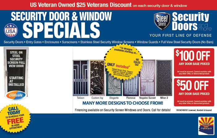 48 WelcomeHomeAZ.net | April 2023 602-814-0251 | SteelShieldSecurity.com $1,199 *Doors shown in this ad are not included in $1,199 special. US Veteran Founded-Family Owned $25 Veterans Discount on each security door & window Security Doors • Entry Gates • Enclosures • Stainless Steel Security Window Screens • Window Guards • Full View Steel Shield Security Doors (No Bars) $1,750 OR MORE $1,799 $1,300 OR MORE • Only Phoenix company licensed to sell CRIMSAFE • Our superior installation techniques differ from our competitors SURPRISE SHOWROOM 12801 W. Bell Rd. • Unit D-121 Open Mon.-Sat. 9am-4pm MESA SHOWROOM 10550 E. Baseline Rd. • Booths C228-230 Open Fri.-Sun. 8am-3pm DEER VALLEY SHOWROOM 21622 N. 14th Ave. Open Mon.-Sat. 9am-4pm Hablamos Español LIMITED TIME OFFER COOL DOWN INFLATION SPECIALS ONLY PLAIN BAR & HORIZON DESIGNS! List Price $1,299 now only $999 Installed Oversized Doors Add $100