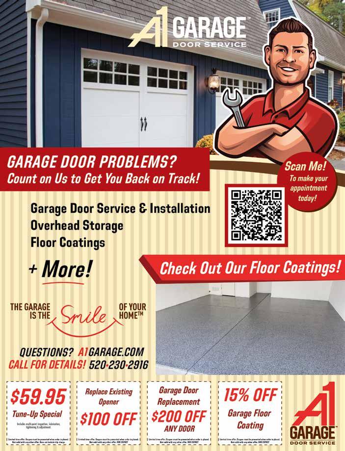 8 WelcomeHomeAZ.net | July/August 2023 /konapoolservice /konapoolservice Residential & Commercial ROC #338889 We Clean Pools • Weekly Cleaning and Chemical Service • Equipment Repairs (Salt System Service and Repairs) • Filter Service and Cleanings • Deck Repairs • Drains • Acid and Chlorine Bathe • Tile Cleaning and Calcium Removal • Remodels Family Owned and Keeping Tucson’s Pools Clean Since 2013 520-308-8486 $199 RACKS STARTING AT INSTALLED, TAX AND ALL! CUSTOMERS THAT DO THEIR HOMEWORK CHOOSE US. CALL FOR A PHONE QUOTE 520-468-0025 BONDED & INSURED HEAVY DUTY 4 X 8 RACKS 1,000 LB. CAPACITY LIFETIME GUARANTEE Not a licensed contractor COMPARE OUR RACKS TO ALL OTHERS. WATCH VIDEO AT: overheadstorageofphoenix.com