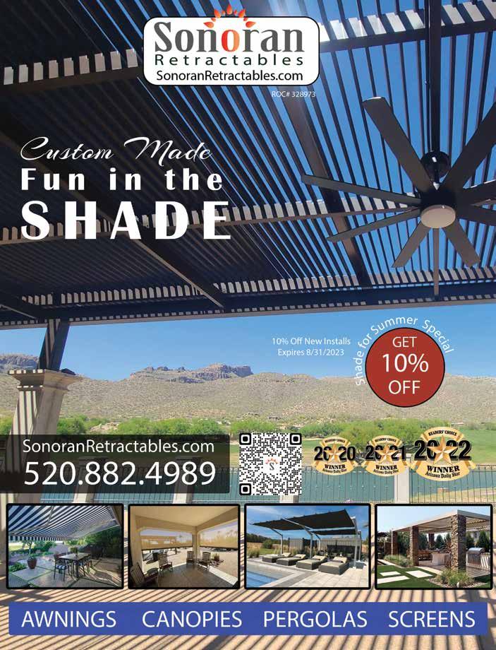 July/August 2023 | WelcomeHomeAZ.net 21 why enclose your patio? Shade & UV Protection Remote Control Operated Keep Your Pets Safe Wind Control Protect Your Furniture Insect Control Keep Out Dust & Debris Expand Your Outdoor Living Space ASK A SHADE EXPERT ABOUT OUR SOLAR OPTIONS! PATIO SHADES RETRACTABLE RETRACTABLE RETRACTABLE INTERIOR SHADES AWNINGS 520.342.0003 call for a free estimate! 20 % off some exclusions may apply Cannot be combined with other offers or discounts. Expires 09/08/2023 VISIT OUR SHOWROOM 816 E. Evans Blvd Tucson, AZ 85713 Mon - Fri 10a - 4p askaboutour Locally Manufactured in Tucson for Over 25 Years 1371 BONDED INSURED • ROC# CR-158170 www.swsuncontrol.com