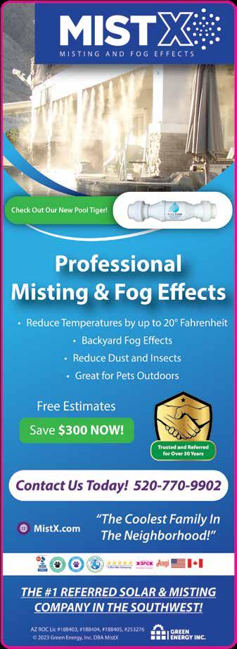 July/August 2023 | WelcomeHomeAZ.net 31 Call Today to Schedule a FREE, NO OBLIGATION Estimate! 520-392-7170 FENIXPOOLSOLAR.COM ROC #333704 Arizona’s Only Dealer for ARIZONA’S #1 SOLAR POOL HEATER DEALER WITH ALL REVIEWS THE BEST WARRANTY IN THE INDUSTRY SAVE on the increasing costs of gas/ electric! $300 OFF ANY NEW FENIX SYSTEM Solar Pool Heater or Mist System when you mention this ad