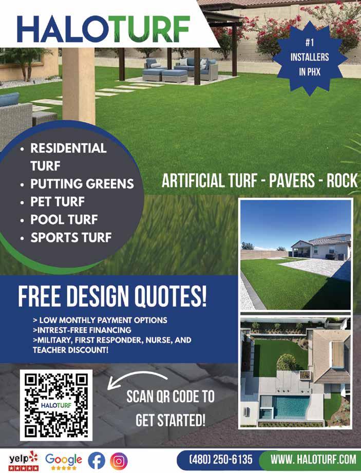 be the envy of the neighborhood or your own personal putting green to strengthen your golf game, their highly qualified team of experts is ready to bring your dreams to fruition with top-of-the-line, U.S.-made turf. Choose from the highest-grade turf products available, resting assured your family, friends, and even pets will still be enjoying your investment for years to come! See their ad on pages 12 & 13 for more details.