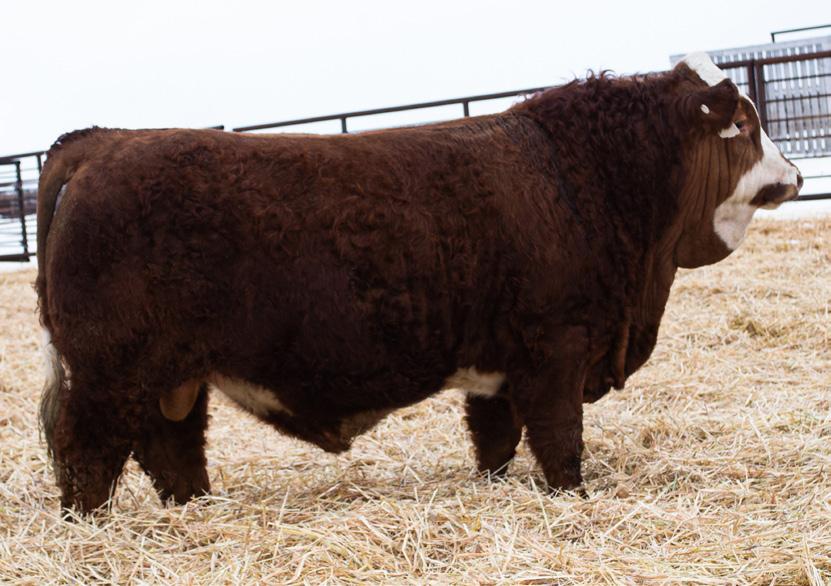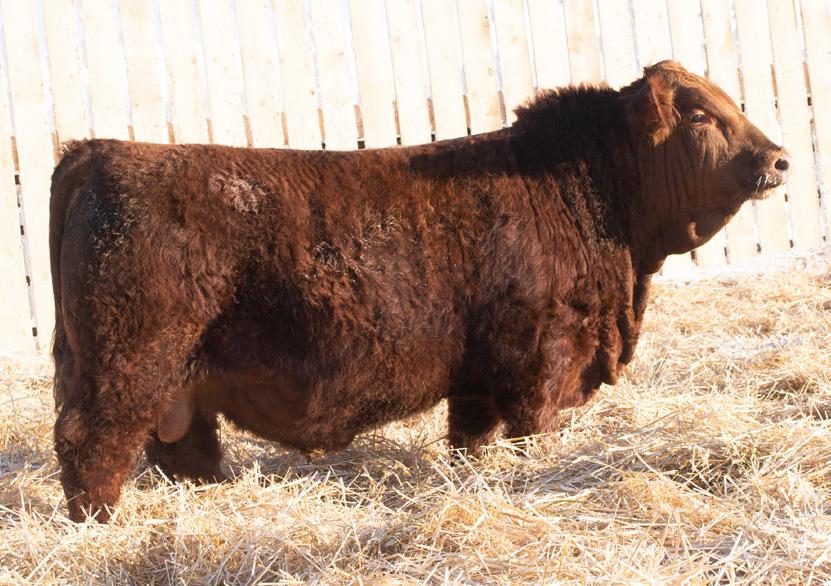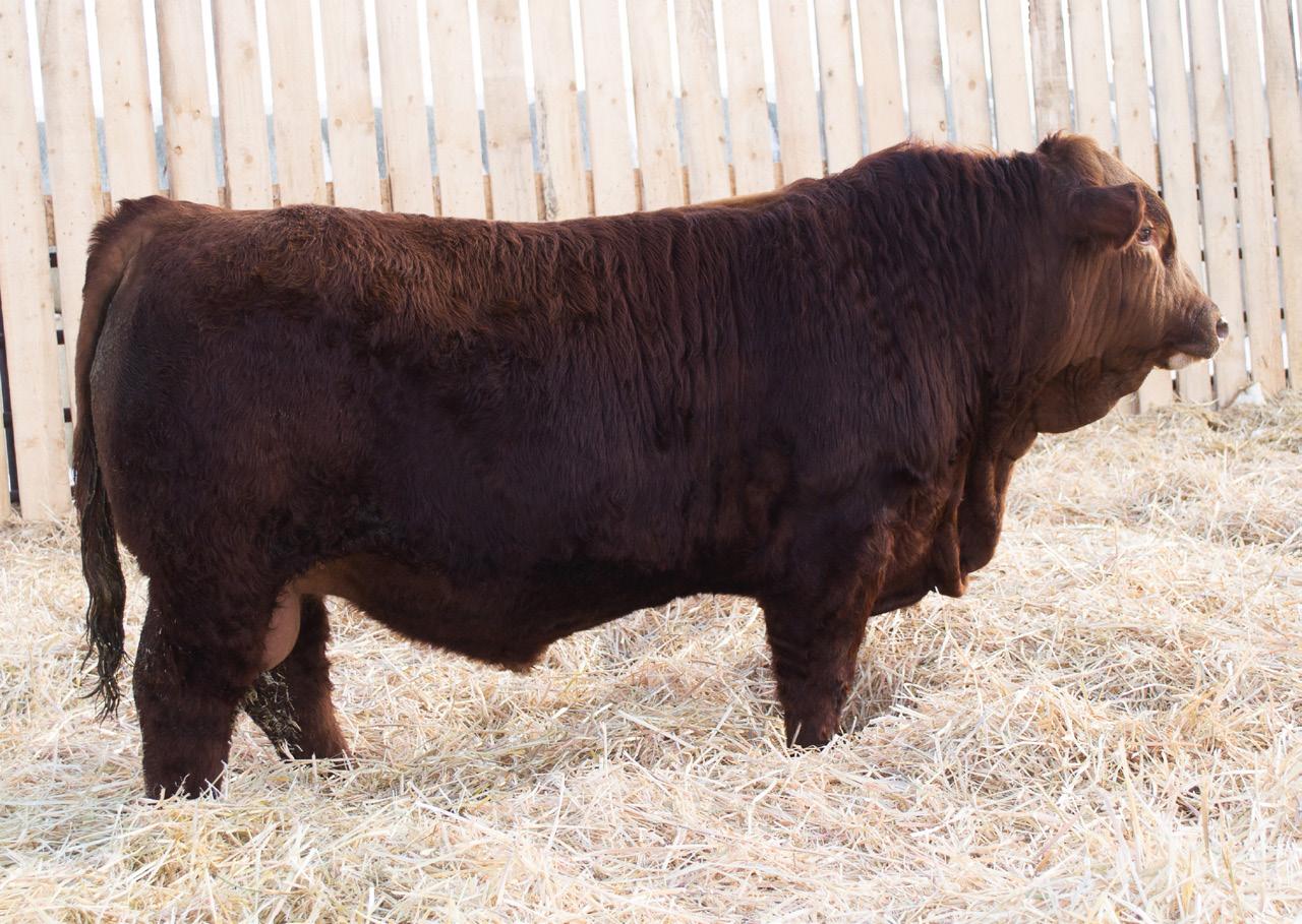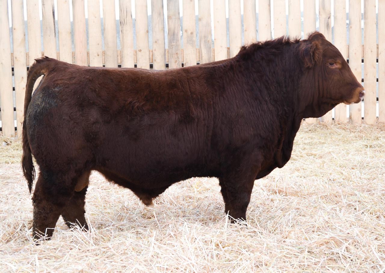 HOMO POLLED. PUREBRED. APPROVED FOR HEIFERS. This is another big haired, dark liver red calf off Top Tier that likely is my favourite. I enjoy breeding cattle that are coloured and built like this. His dam was purchased on the lead off pair at the Werstroh Dispersal where we bought 68L along with her dam 3H. Nice small birthweight of 83 lbs, another bull that will calve easy but be extremely growthy. Not too often can you see a first calf heifer wean off a calf at 925lbs! He is ranked high in the calving ease EPD and one that is going to really knock it out of the park. Come see his Dam in person, we feel she is the ideal type and kind of cow that we strive to build a cowherd around. You’ll know he’s the real deal once you get in the pen with him.