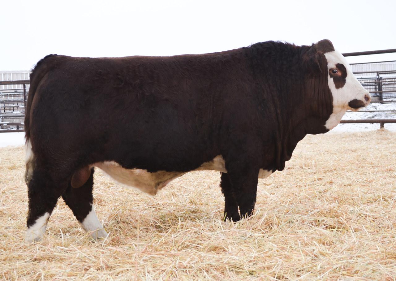 HETERO POLLED. PUREBRED. I always start the catalogue with a calf that I think would work for many different cattle producers. This one has really tugged at my heart strings, and I think that he would add a lot of important characteristics to a cowherd. The day he was born I thought, “My god I think this one will be cool next year.” A February 7th calf that can stand up with the older bulls and is a great representation of the type of bulls we strive to produce. His Dam, 67H is a black baldie female who raised a nice bull a few years back to Aumack Simmentals and Cody Adamson. When you come tour the bull pen, this is one that sticks out like a sore thumb. He is deep and soggy, super stout, and big barrelled. The Robb sire makes some big, nutted sons. 132N is one that I think is so right for today’s cattle business that I think would be beneficial to use in our own program. Retaining 50 Straws for In-Herd Use.