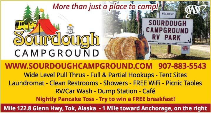 Eagle’s Rest RV Park has supersized, 70-foot pull-through sites with full hookups (20-50 amp). There is a separate grassy tenting area, clean hot showers, Laundromat and dump station. Cozy modern cabins have private bathroom, cable TV, fridge, microwave & coffee maker. Let their local experts help book your tours and attractions. 139 E. Pioneer Drive. 907-835-2373 or 800-553-7275