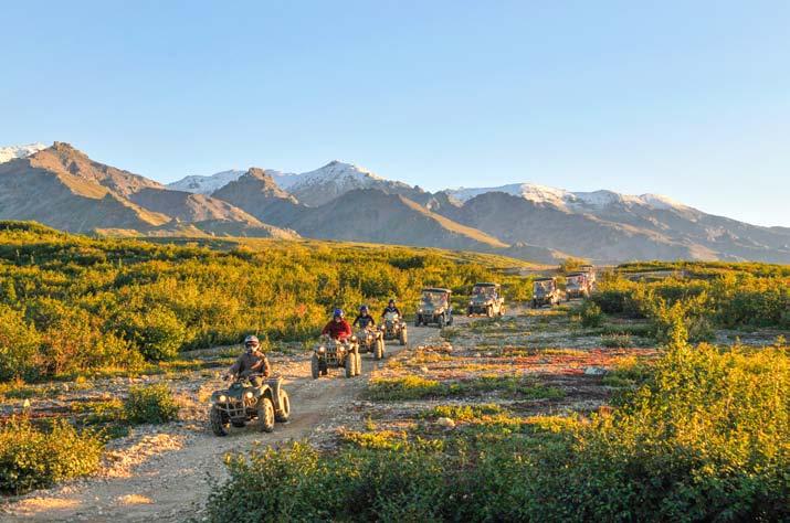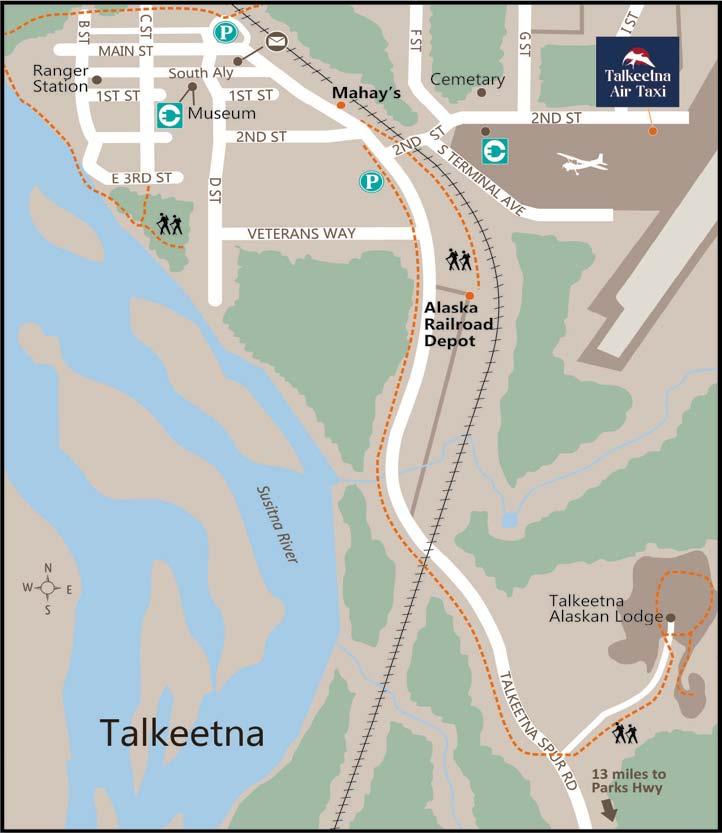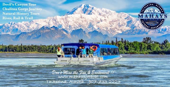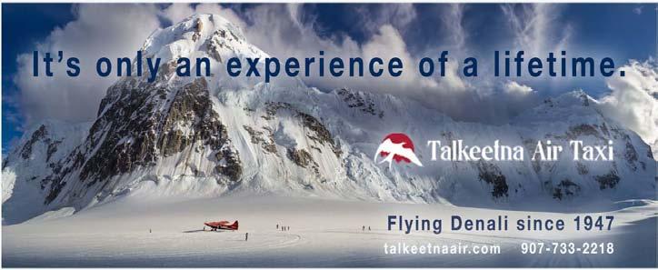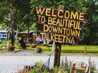 Talkeetna , accessed via a 14 mile spur road at mile 99 is an adventure filled town with Jetboats, ziplining and flightseeing tours. Talkeetna is famous as the basecamp for most Denali climbing expeditions and a great place to take a flightseeing tour of Denali and the Alaska Range. (See pg 85)