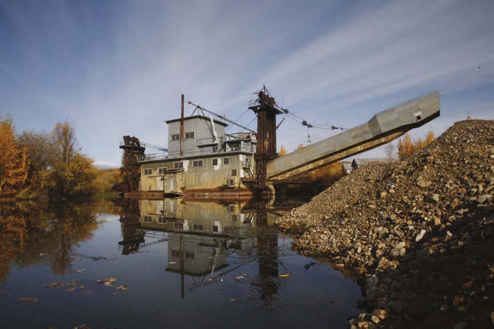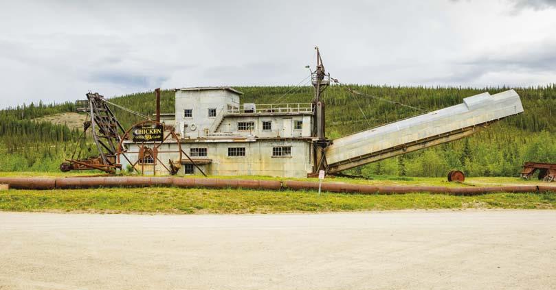 In 1939, the F.E. Company began acquiring claims and built a camp on Nora Bench. In 1953 they bought the town site and turned it into a camp for their dredging operation. Dredge #4 (the Pedro Dredge) was moved from Fairbanks to Chicken in 1959 and was operated until 1967. In 1998, after sitting idle for 31 years, the million pound dredge was moved in one piece to its present location in town. Chicken Gold Camp, RV Park and Outpost with rooms and cabins. The “Outpost” gift store has Alaska artisan made gifts, clothing, jewelry and more. The cafe serves homemade entrees, fresh-baked pastries, espresso drinks, wood-fired pizza and Alaska craft beers. The camp features gold panning, gold mining outings and historic tours. Chicken Gold Camp is a National Historic Site, which includes the Pedro Dredge and mining museum. 1/4 mile south on Airport Road in Chicken. 907-782-4427
