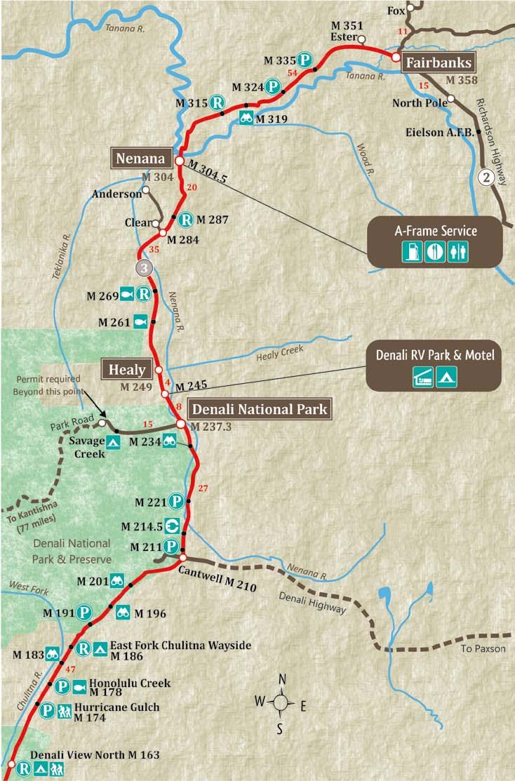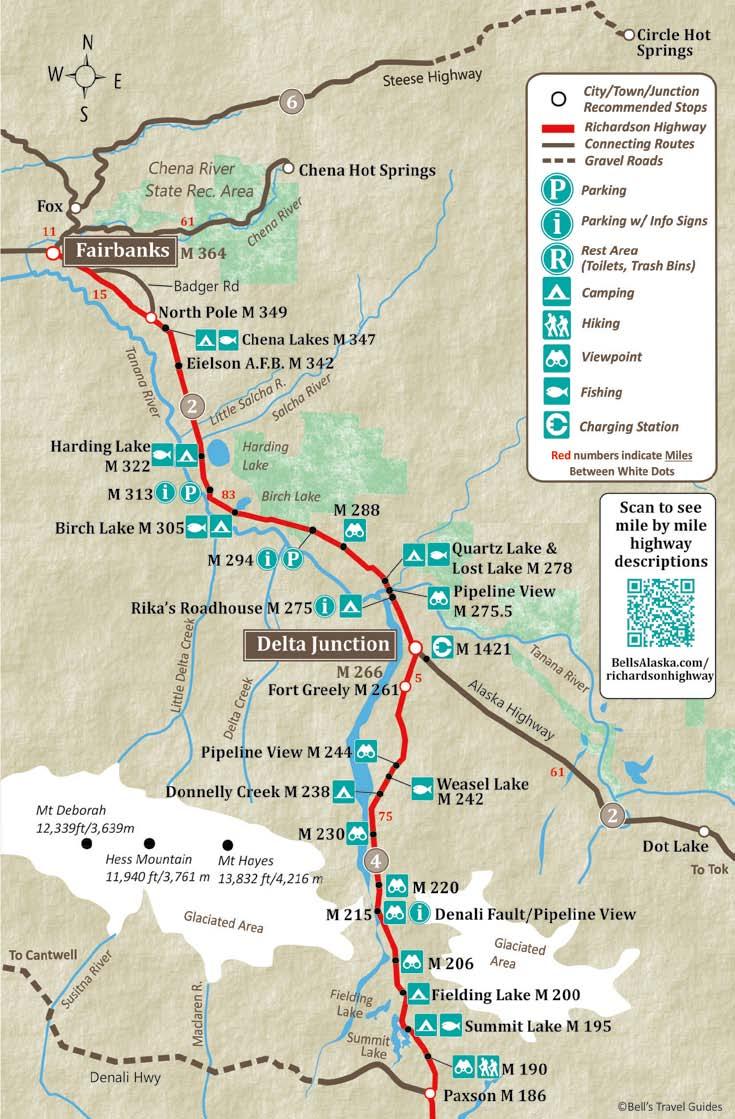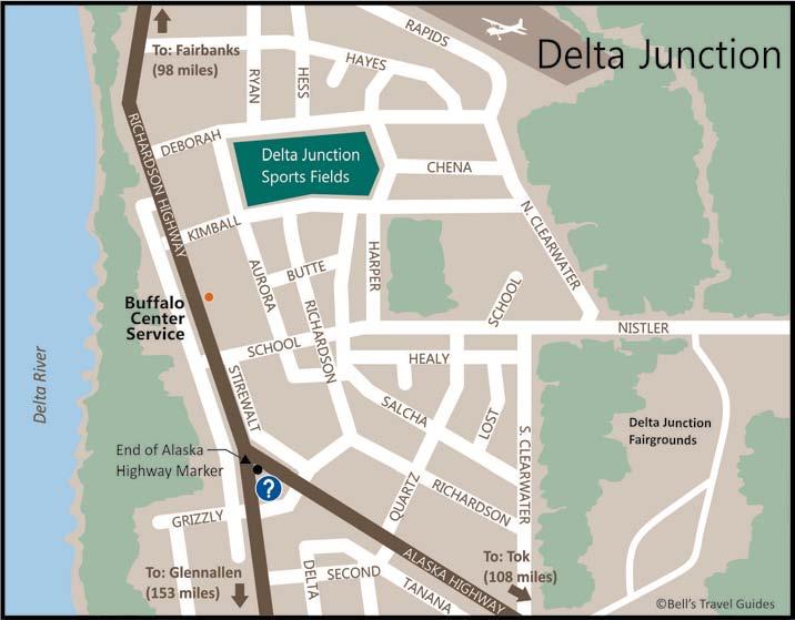 at mile 210 on the Parks Highway, 27 miles south of the entrance to Denali National Park. It is a very scenic drive, with excellent views of Denali, however, many rental companies will not allow their vehicles to drive the Denali Highway (See pg 93) Delta Junction is the junction of the Richardson and Alaska Highways. At Delta Junction, the Richardson Highway number changes from Route 4 to Route 2. Delta Junction is the end of the Alaska Highway. Big Delta State Historical Park on the north end of Delta Junction is a 10 acre park with RV camping, picnic area, toilets, water and an RV dump station, located at mile 275. There are a number of historical buildings on the grounds, including a