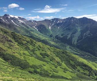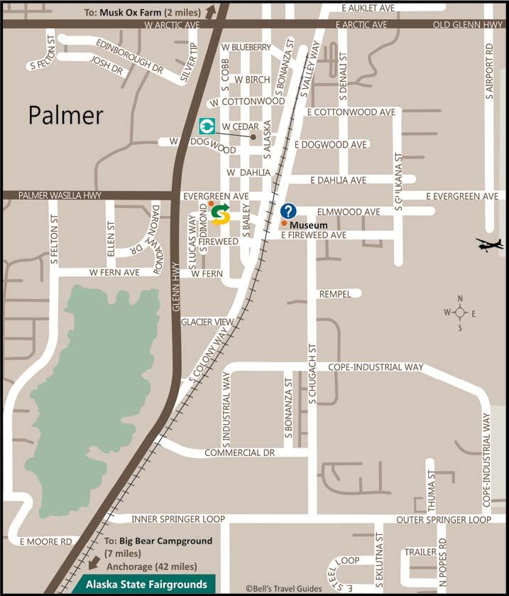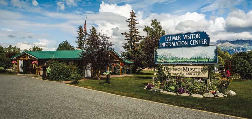 Palmer, at mile 42, is a unique community in Alaska and has much to offer the visitor. Nestled at the foot of Pioneer Peak, it has great accommodations, camping and dining (see pg 82).