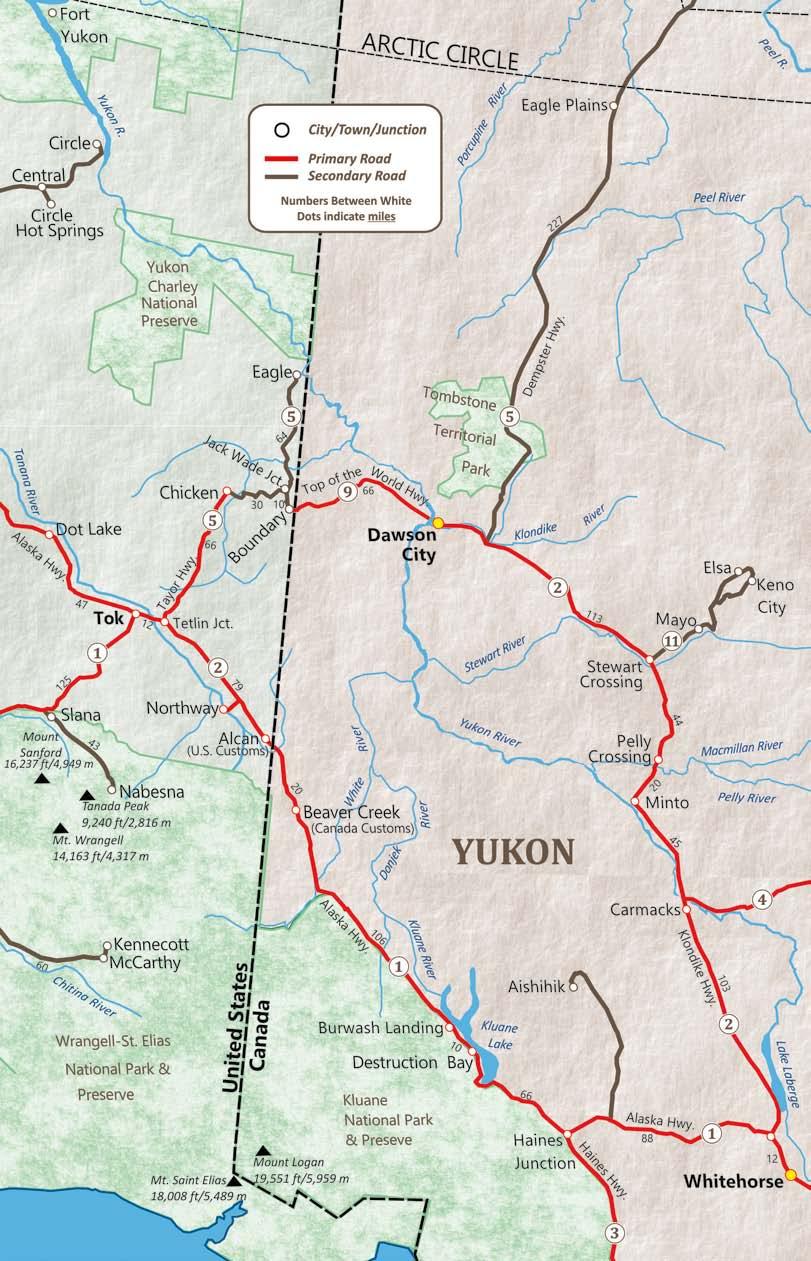 Mile 1302 is the junction with the Taylor Highway which accesses Eagle and Chicken in Alaska and Dawson City, in the Yukon.