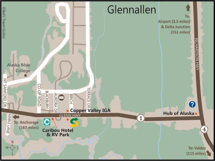 Lake Louise State Recreation Area is reached via a 17 mile spur road from mile 160 of the Glenn Highway. Lake Louise is a favorite destination for local Alaskans looking for fishing, boating, hiking and bird watching. There is excellent fishing for lake trout, whitefish, burbot and arctic grayling. Glennallen is at the end of the Glenn Highway, where the road junctions with the Richardson Highway (Mile 189). Glennallen is the gateway to Wrangell-St. Elias National Park, the largest National Park in the United States (See pg 44).