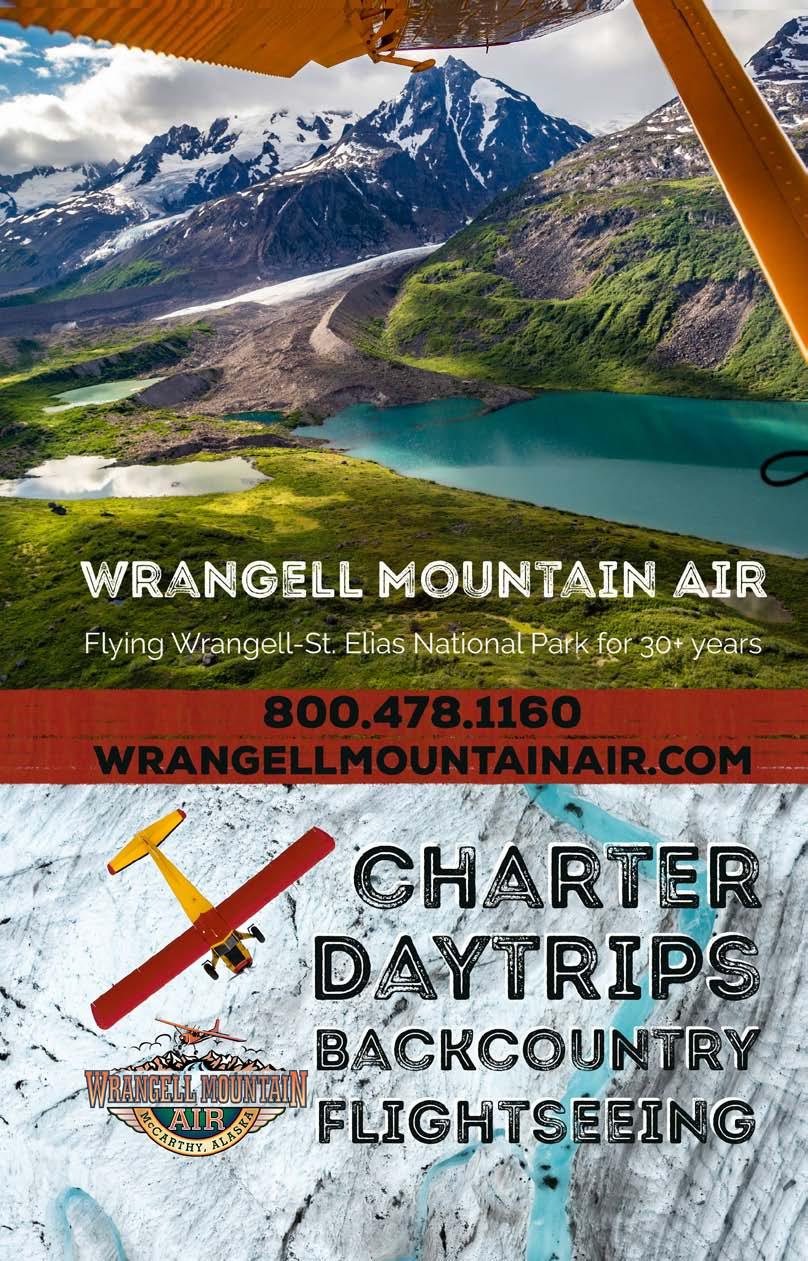 the Alyeska Pipeline Pump Station #12, the final pump station before Valdez. There is no public access. The Wrangell-St. Elias National Park is the largest National Park in the U.S. and a UNESCO World Heritage Site. If you want to drive into the park, take the Edgerton Highway, at mile 82.5, to Chitna. The road is good to Chitna but the McCarthy Road from Chitna to McCarthy/Kennecott can be rough and challenging. Our recommendation is that you fly in with Wrangell Mountain Air. They offer daily scheduled air service and day tours to McCarthy from the airports at Chitna and Glennallen. Call 907-258-2350 or 800-478-1160 for reservations.